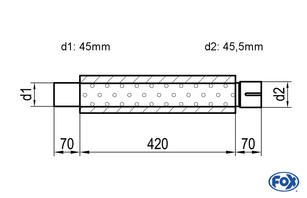 Der hochwertige FOX Uni-Schalldämpfer rund aus Edelstahl überzeugt durch seine robuste Konstruktion und vielseitige Einsetzbarkeit. Mit einem Außendurchmesser von Ø100 mm, einer Gesamtlänge von 420 mm und Stutzen mit d1Ø 45 mm sowie d2Ø 45,5 mm eignet er sich ideal für den universellen Einsatz im Bereich Fahrzeug-Tuning und Auspuffbau. Dank der Edelstahl-Ausführung bietet der Dämpfer hervorragenden Korrosionsschutz, lange Lebensdauer und eine sportliche Optik.