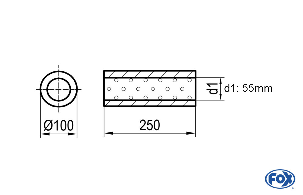 Der FOX Uni-Schalldämpfer rund ohne Stutzen überzeugt durch seine hochwertige Edelstahlkonstruktion und universelle Einsetzbarkeit. Mit einem Außendurchmesser von Ø 100 mm, einer Abwicklung von 314 mm, einem Anschlussdurchmesser (d1) von Ø 55 mm und einer Gesamtlänge von 250 mm bietet dieser Dämpfer eine langlebige und passgenaue Lösung für individuelle Auspuffanlagen.