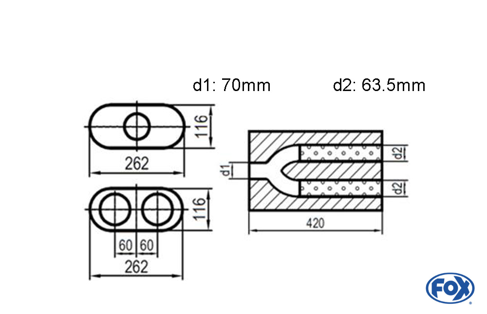 Der FOX Uni-Schalldämpfer oval zweiflutig mit Schlauchanschluss von 650 mm Abwicklung überzeugt durch seine hochwertige Edelstahl-Ausführung. Mit den Maßen von 262x116 mm, einem Eingangsrohr-Durchmesser von 70 mm (d1Ø), einem Ausgangsdurchmesser von 63,5 mm (d2Ø) und einer Gesamtlänge von 420 mm ist dieser Dämpfer ideal für Individualanpassungen geeignet. Dank der universellen Bauweise kann der Schalldämpfer flexibel eingesetzt werden – etwa für Sonderumbauten, Motorsportanwendungen oder individuelle Tuning-Projekte.