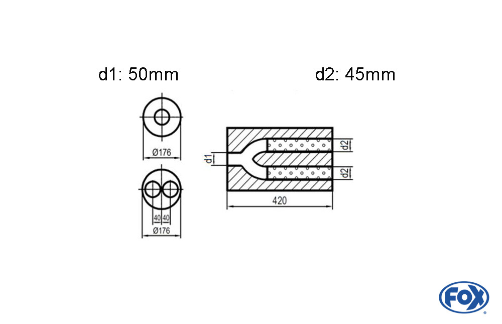 Der FOX Uni-Schalldämpfer rund zweiflutig bietet eine hochwertige Lösung für universelle Auspuffanlagen. Gefertigt aus langlebigem Edelstahl, überzeugt dieser Schalldämpfer durch hohe Korrosionsbeständigkeit und präzise Verarbeitung. Mit einem Außendurchmesser von Ø176 mm, einem Anschlussdurchmesser von d1 Ø50 mm außen, d2 Ø45 mm außen und einer Gesamtlänge von 420 mm eignet sich dieser Dämpfer ideal für individuelle Anpassungen an unterschiedlichste Fahrzeugprojekte.