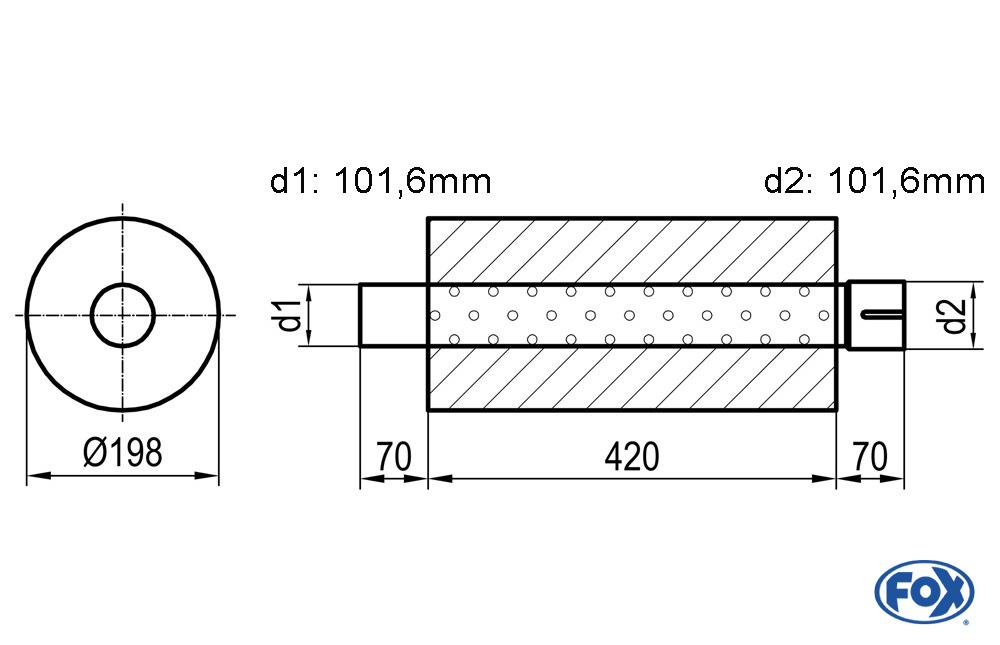 - 1x FOX Uni-Schalldämpfer rund Ø198 mm, Länge 420 mm