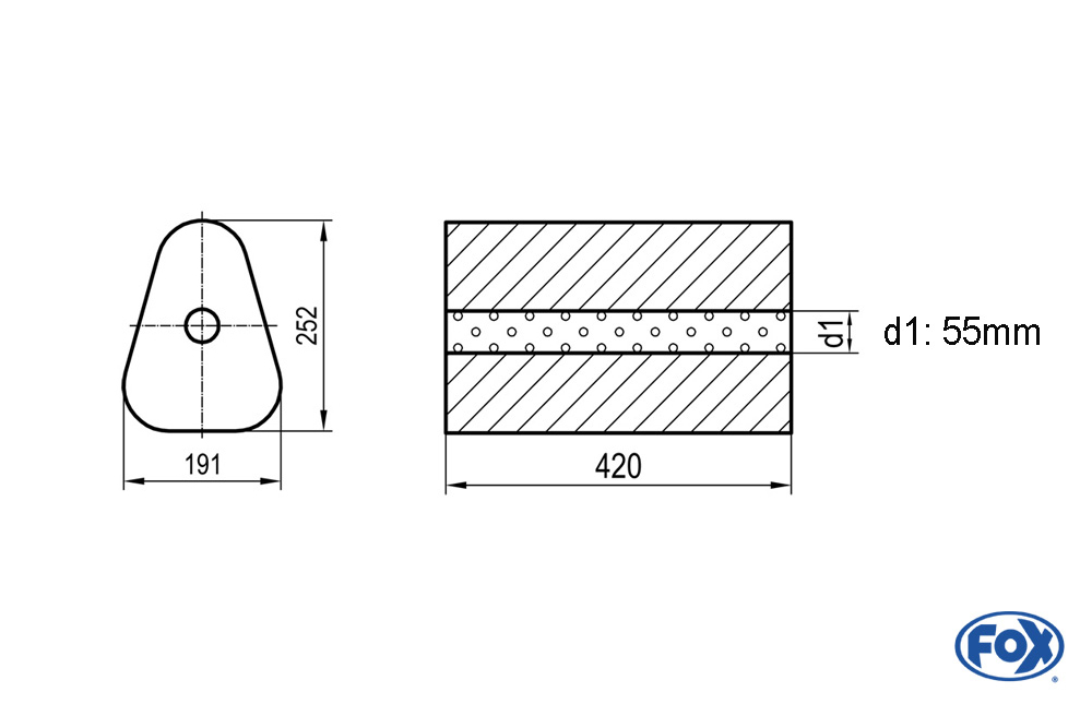 Der FOX Uni-Schalldämpfer in dreieckiger Bauform überzeugt durch seine hochwertige Verarbeitung aus Edelstahl und universelle Einsetzbarkeit. Mit einer Länge von 420 mm, einem Außenmaß von 191 x 252 mm (Abwicklung 725) und einem Anschlussdurchmesser von Ø 55 mm außen eignet sich dieser Schalldämpfer bestens für individuelle Auspuffanwendungen. Sein robuster Edelstahlkörper sorgt für hohe Haltbarkeit und optimale Schallabsorption bei kraftvollem Sound.