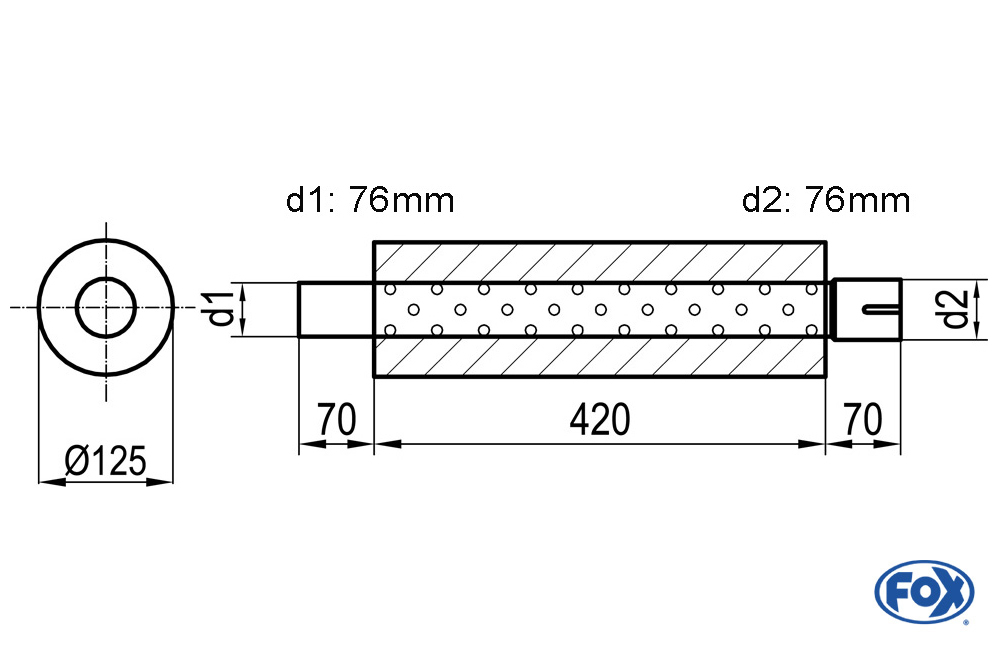Der hochwertige FOX Uni-Schalldämpfer besteht aus robustem Edelstahl und überzeugt durch präzise Verarbeitung sowie vielseitige Einsatzmöglichkeiten. Mit einem Durchmesser von 125 mm, einer Länge von 420 mm und Stutzenmaßen von d1Ø 76 mm und d2Ø 76,5 mm bietet dieser runde Schalldämpfer eine universelle Lösung für zahlreiche Auspuffanwendungen. Dank der Edelstahlkonstruktion ist der Dämpfer besonders langlebig, korrosionsbeständig und für den Dauerbetrieb ausgelegt.