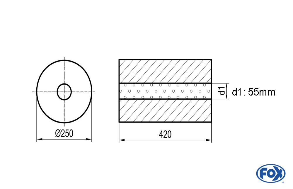 - 1x FOX Uni-Schalldämpfer rund ohne Stutzen, Ø250 mm, Länge 420 mm, d1 55 mm