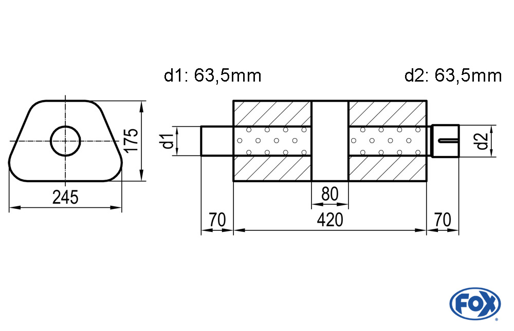 - 1x FOX Uni-Schalldämpfer trapez mit Kammer und Stutzen (Abwicklung 711, Maße: 245x175mm, d1Ø 63,5mm außen, d2Ø 63,5mm innen, Länge 420mm)