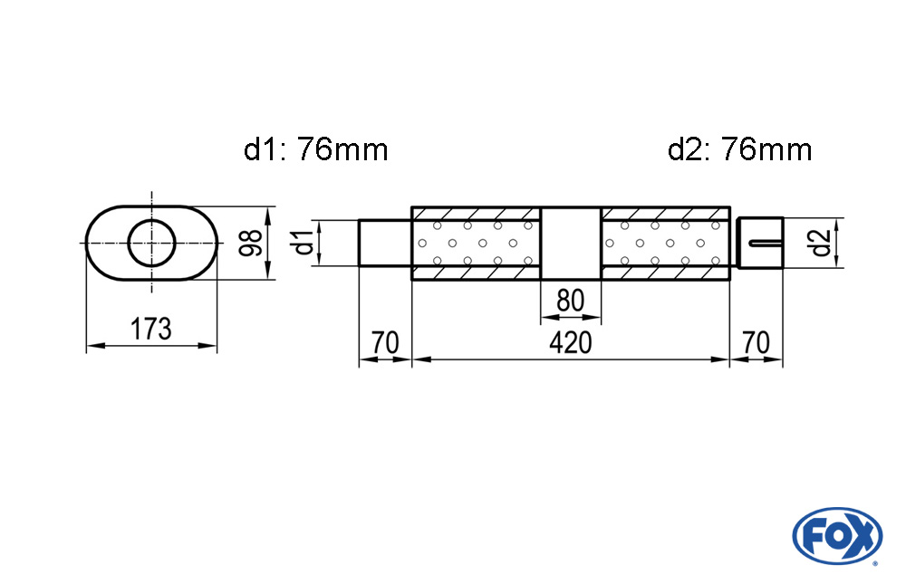 Der FOX Uni-Schalldämpfer in ovaler Bauform überzeugt durch hochwertige Verarbeitung aus Edelstahl und vielseitige Einsatzmöglichkeiten. Mit einer Gesamtlänge von 420 mm und einem ovalen Querschnitt von 173 × 98 mm ist dieser Dämpfer eine ideale Lösung für individuelle Auspuffanlagen, bei denen Klang, Leistung und Haltbarkeit eine entscheidende Rolle spielen.