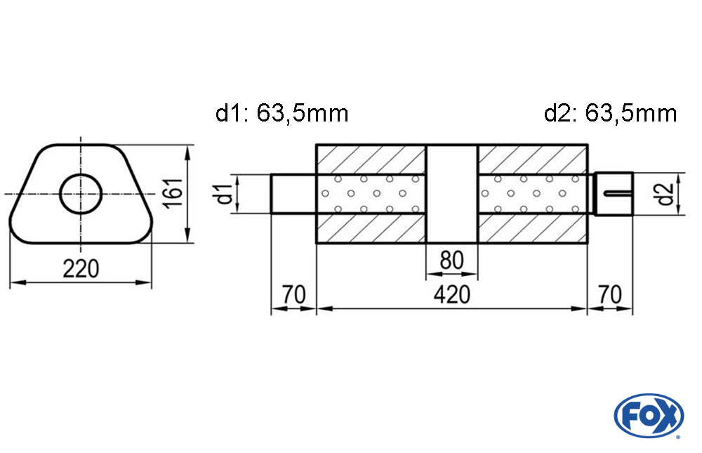 Der FOX Uni-Schalldämpfer in trapezförmiger Bauweise mit integrierter Kammer und Stutzen überzeugt durch hochwertige Verarbeitung aus Edelstahl und universellen Einsatzmöglichkeiten. Mit den Maßen 220x161 mm und einer Gesamtlänge von 420 mm bietet dieser Dämpfer eine ideale Basis für individuelle Auspuffprojekte. Die Anschlussdurchmesser betragen 63,5 mm außen (d1Ø) und 63,5 mm innen (d2Ø).