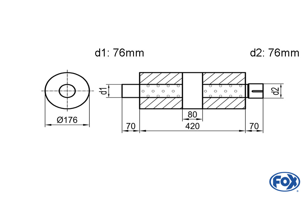 Der FOX Uni-Schalldämpfer rund mit Kammer und Stutzen bietet eine robuste und langlebige Lösung für individuelle Abgasanlagen. Gefertigt aus hochwertigem Edelstahl überzeugt dieser Universaldämpfer durch präzise Verarbeitung und hervorragende Schalldämpfung. Mit einem Durchmesser von Ø176 mm und einer Gesamtlänge von 420 mm sorgt der FOX Dämpfer für ein ausgewogenes Verhältnis zwischen Klangoptimierung und Abgasführung. Die Anschlussdurchmesser betragen außen Ø76 mm (d1) und innen Ø76 mm (d2), wodurch eine flexible Integration in verschiedene Abgassysteme möglich ist.