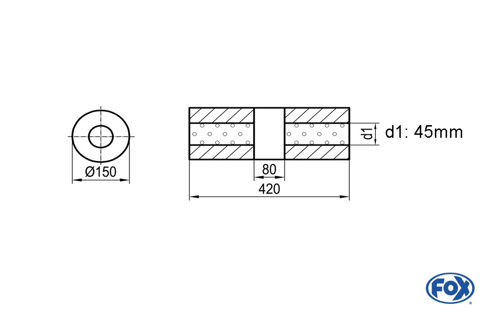 - 1x FOX Uni-Schalldämpfer rund ohne Stutzen mit Kammer – Ø150mm, d1Ø45mm (außen), Länge 420mm