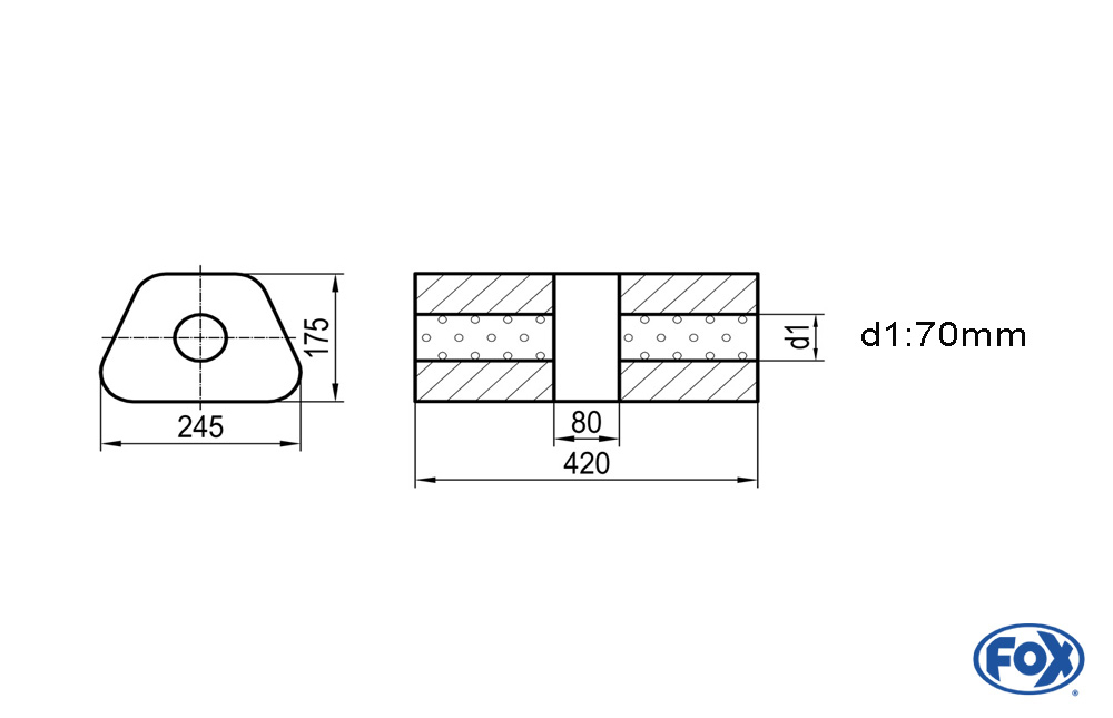 - 1x FOX Uni-Schalldämpfer trapez ohne Stutzen mit Kammer (Abw. 711, 245x175mm, Ø70mm, Länge 420mm)