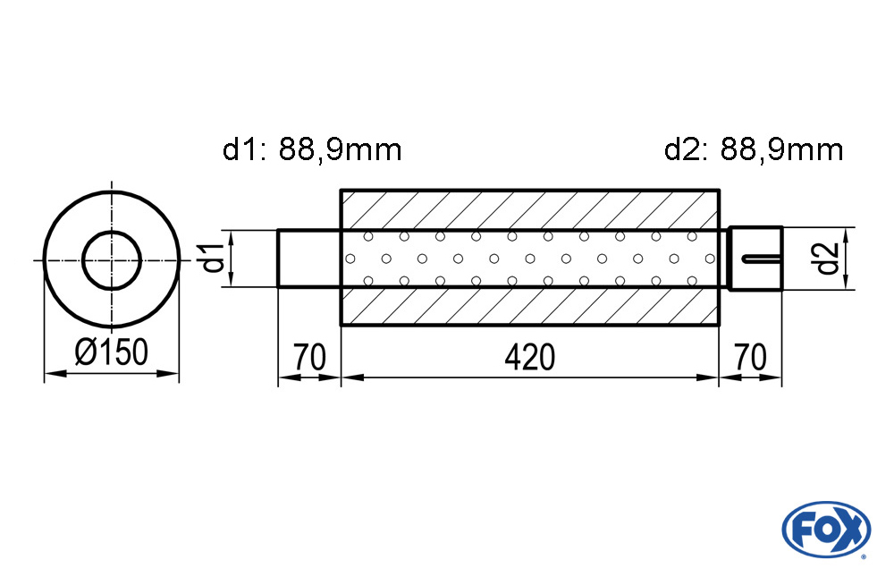 - 1x FOX Uni-Schalldämpfer Edelstahl rund Ø150 mm, Länge 420 mm