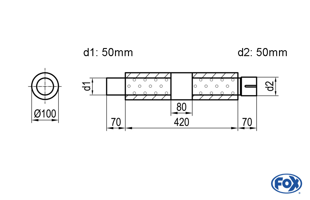 Der FOX Uni-Schalldämpfer rund mit Kammer und Stutzen ist die ideale Lösung für individuelle Abgasanlagen und Sonderanfertigungen. Hergestellt aus hochwertigem Edelstahl, überzeugt er durch Langlebigkeit, Korrosionsbeständigkeit und präzise Verarbeitung. Mit einem Außendurchmesser von Ø100 mm, Stutzen-Innendurchmesser von Ø50 mm (innen/außen) und einer Gesamtlänge von 420 mm bietet der Dämpfer eine hervorragende Grundlage für universelle Anwendungen im Fahrzeugbau und Tuningbereich.