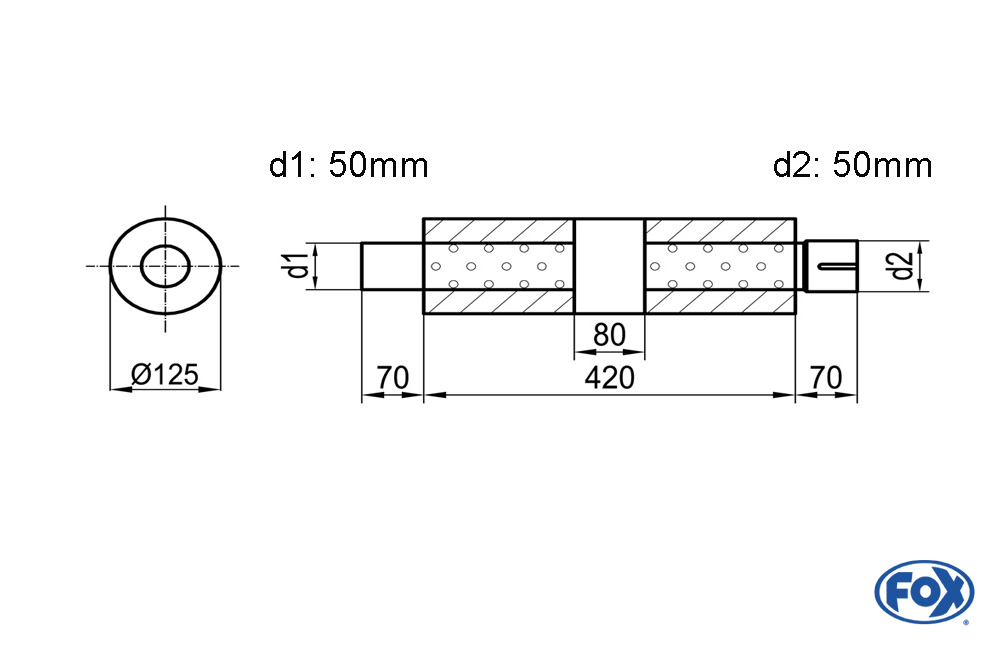 - 1x FOX Uni-Schalldämpfer rund Ø125 mm, Länge 420 mm