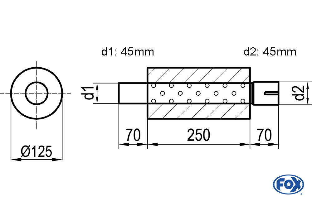 Der FOX Uni-Schalldämpfer überzeugt durch seine hochwertige Verarbeitung aus Edelstahl und ist ideal für den universellen Einsatz im Fahrzeugtuning-Bereich geeignet. Mit einem Rohrdurchmesser von Ø125 mm, einer Gesamtlänge von 250 mm sowie den Anschlüssen d1Ø 45 mm und d2Ø 45,5 mm bietet dieser Schalldämpfer eine optimale Grundlage für individuelle Auspuffanlagen.