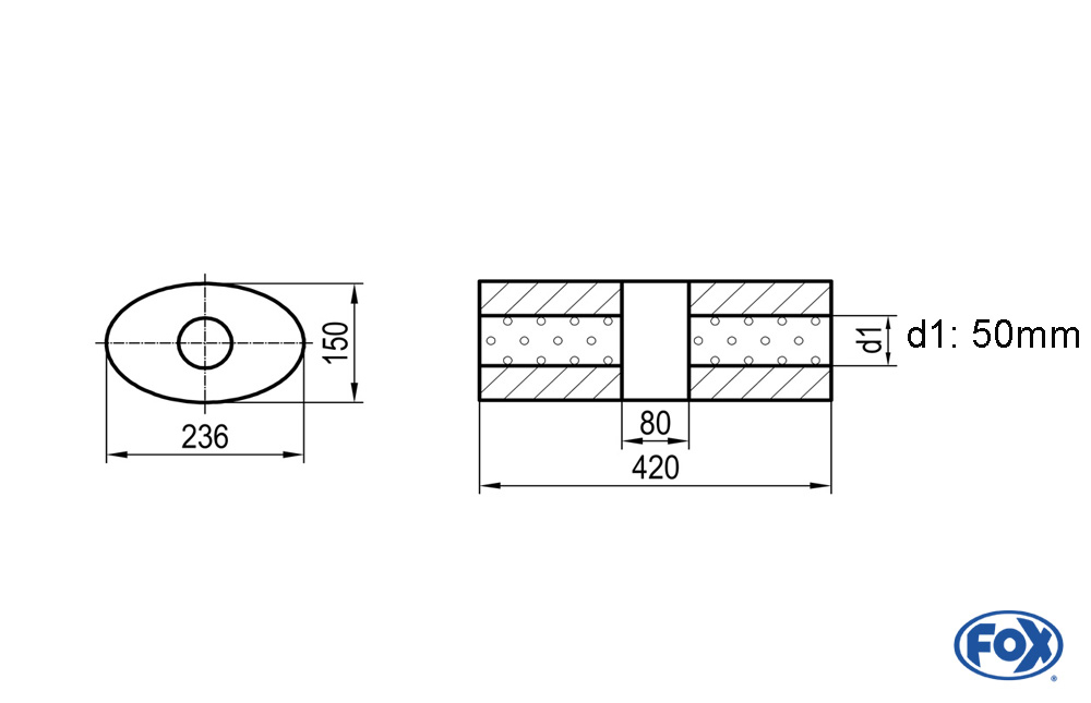 - 1x FOX Uni-Schalldämpfer oval ohne Stutzen mit Kammer, 236x150 mm, d1Ø 50 mm, Länge 420 mm
