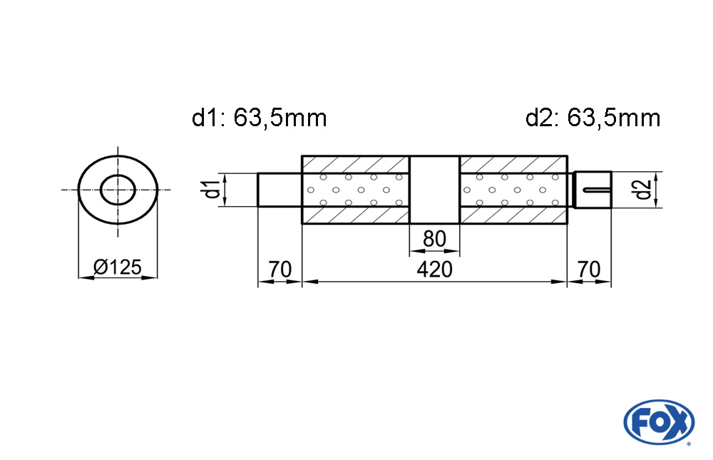 - 1x FOX Uni-Schalldämpfer rund mit Kammer + Stutzen Ø 125 mm