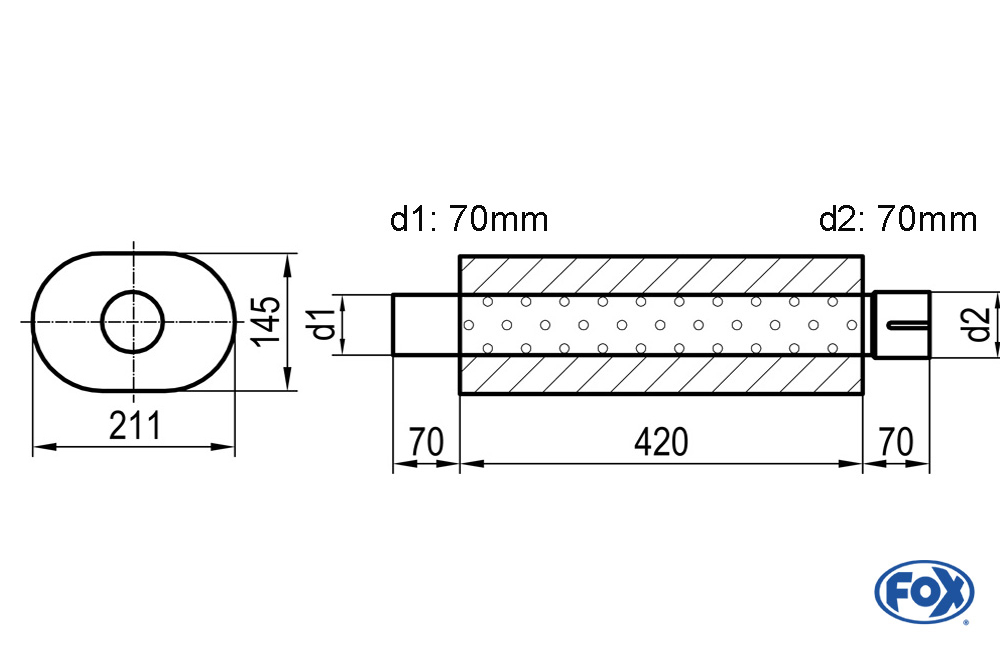 - 1x FOX Uni-Schalldämpfer oval Edelstahl 211x145mm, d1Ø 70mm, d2Ø 70,5mm, Länge 420mm