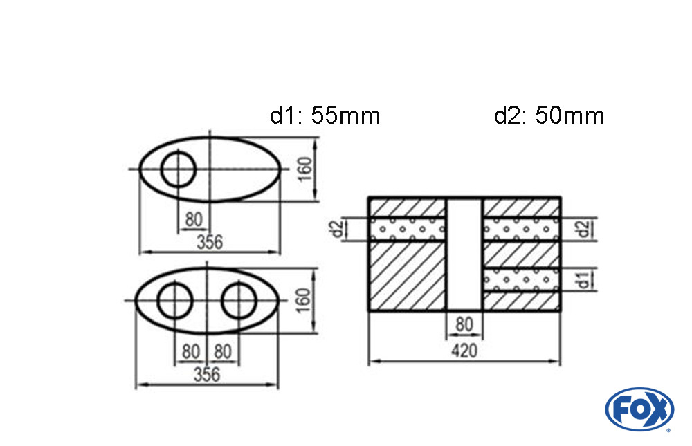 Der FOX Uni-Schalldämpfer in ovaler, zweiflutig ausgeführter Bauweise überzeugt durch erstklassige Verarbeitung aus hochwertigem Edelstahl. Mit seinen Maßen von 356x160 mm, einer Gesamtlänge von 420 mm sowie Anschlussdurchmessern von d1Ø 55 mm und d2Ø 50 mm bietet dieser Schalldämpfer universelle Einsatzmöglichkeiten. Die Kammerkonstruktion sorgt für einen ausgewogenen Klang und eine optimierte Abgasführung – ideal für individuelle Sportauspuff-Projekte und Sonderanfertigungen.
