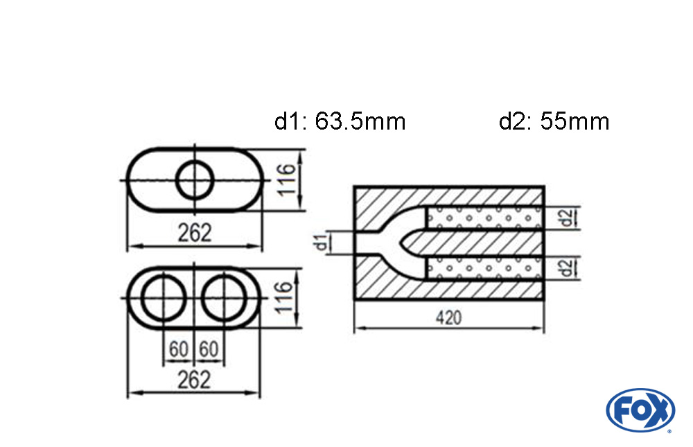 Der ovale FOX Uni-Schalldämpfer mit zweiflutigem Ausgang überzeugt durch seine hochwertige Verarbeitung aus langlebigem Edelstahl und universelle Einsetzbarkeit. Dank der präzisen Fertigung mit Abwicklung 650, einem Maß von 262x116 mm, einem Einlassdurchmesser (d1) von 63,5 mm und einem Auslassdurchmesser (d2) von 55 mm sowie einer Gesamtlänge von 420 mm ist dieser Schalldämpfer ideal für individuelle Abgasanlagen geeignet.