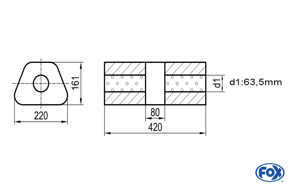 - 1x FOX Uni-Schalldämpfer trapez ohne Stutzen, 220x161mm, d1Ø 63,5mm, Länge 420mm