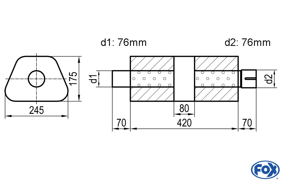 Der FOX Uni-Schalldämpfer trapez mit Kammer und Stutzen besteht aus hochwertigem Edelstahl und überzeugt durch seine robuste Bauweise sowie universelle Einsatzmöglichkeiten. Mit einer Länge von 420 mm und Abmessungen von 245 x 175 mm bietet dieser Schalldämpfer hervorragende Geräuschdämmung bei gleichzeitig sportlichem Klangbild. Der Anschlussdurchmesser beträgt außen 76 mm (d1Ø) und innen 76 mm (d2Ø). Dank der trapezförmigen Bauweise eignet sich dieser Dämpfer optimal für individuelle Abgasanlagenprojekte, bei denen Platzverhältnisse und Klang abgestimmt werden müssen.