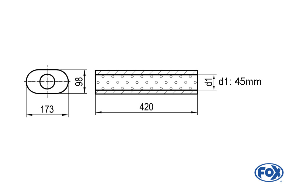 - 1x FOX Uni-Schalldämpfer oval ohne Stutzen (173x98mm, Länge 420mm, d1Ø 45mm)