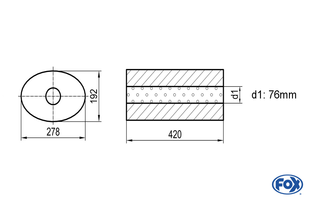 - 1x FOX Uni-Schalldämpfer oval ohne Stutzen (Abwicklung 754, 278x192mm, Länge 420mm, d1Ø 76mm)