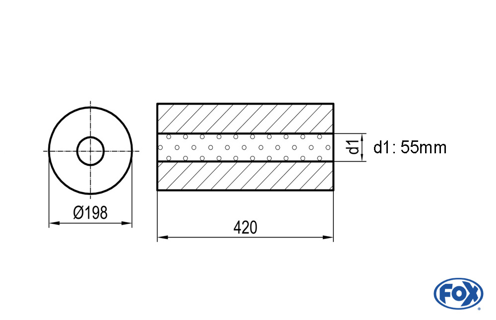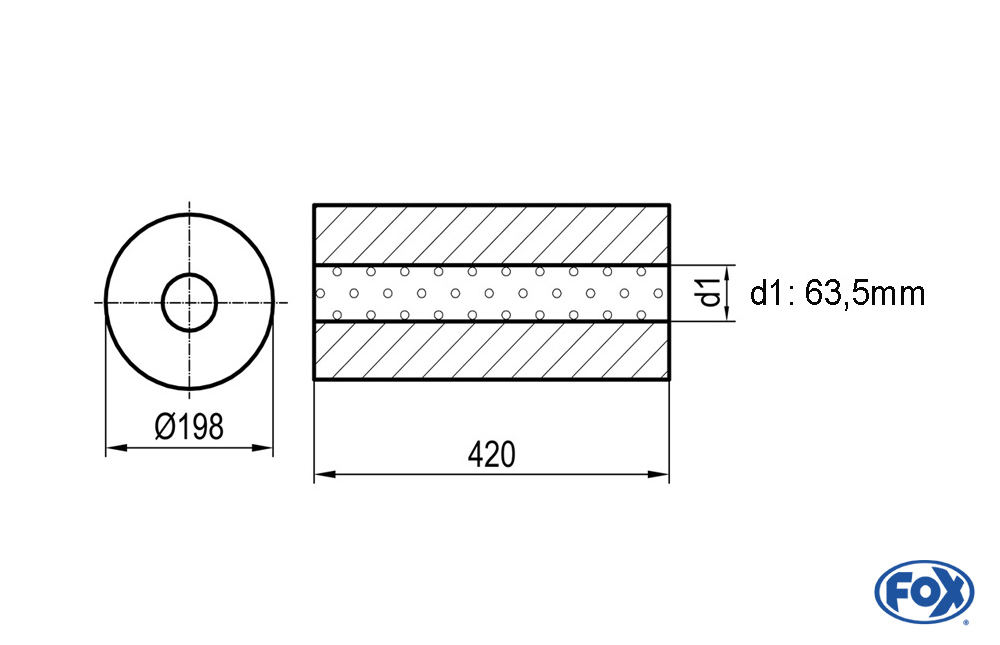 - 1x FOX Uni-Schalldämpfer rund ohne Stutzen Ø198 mm, Länge 420 mm