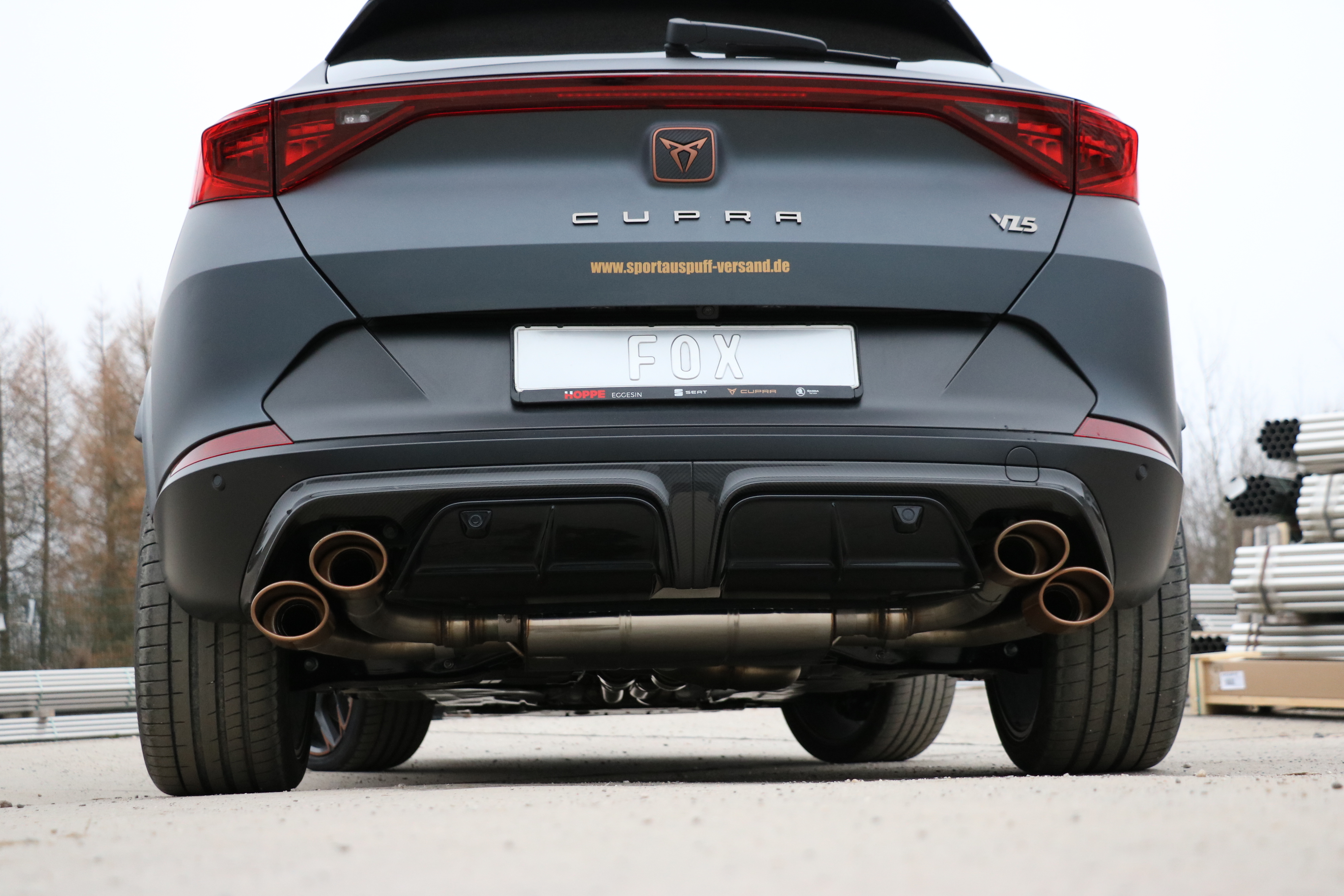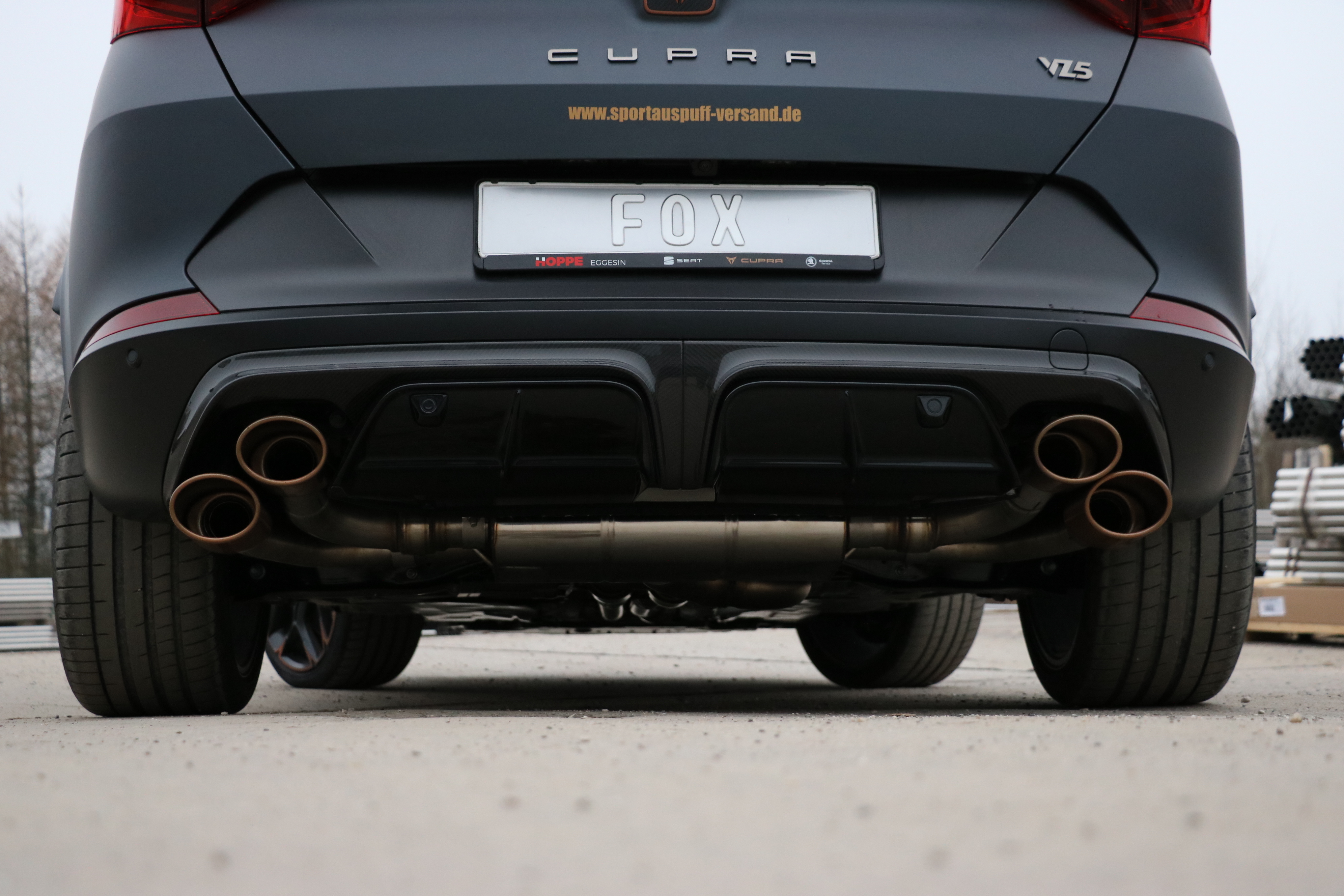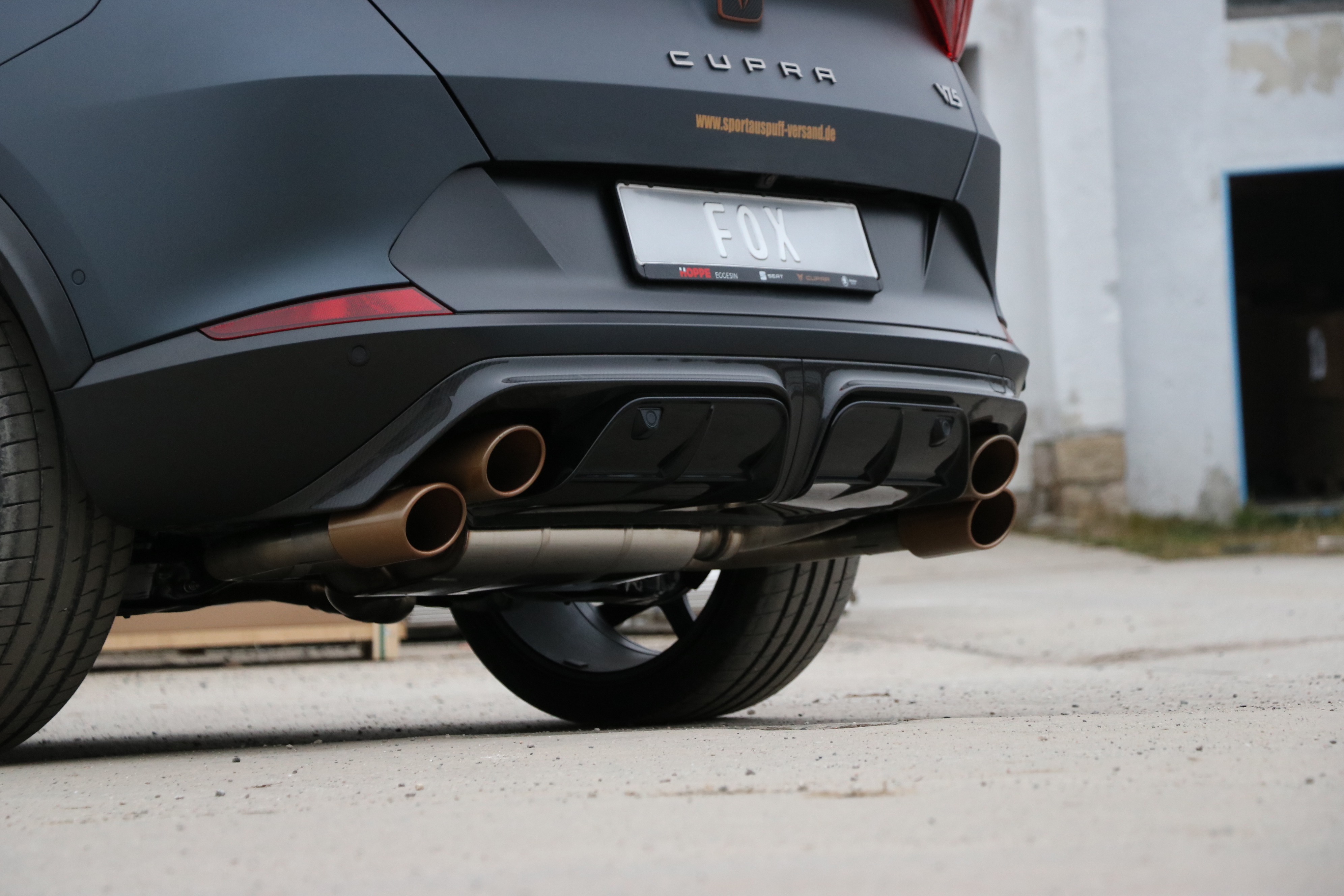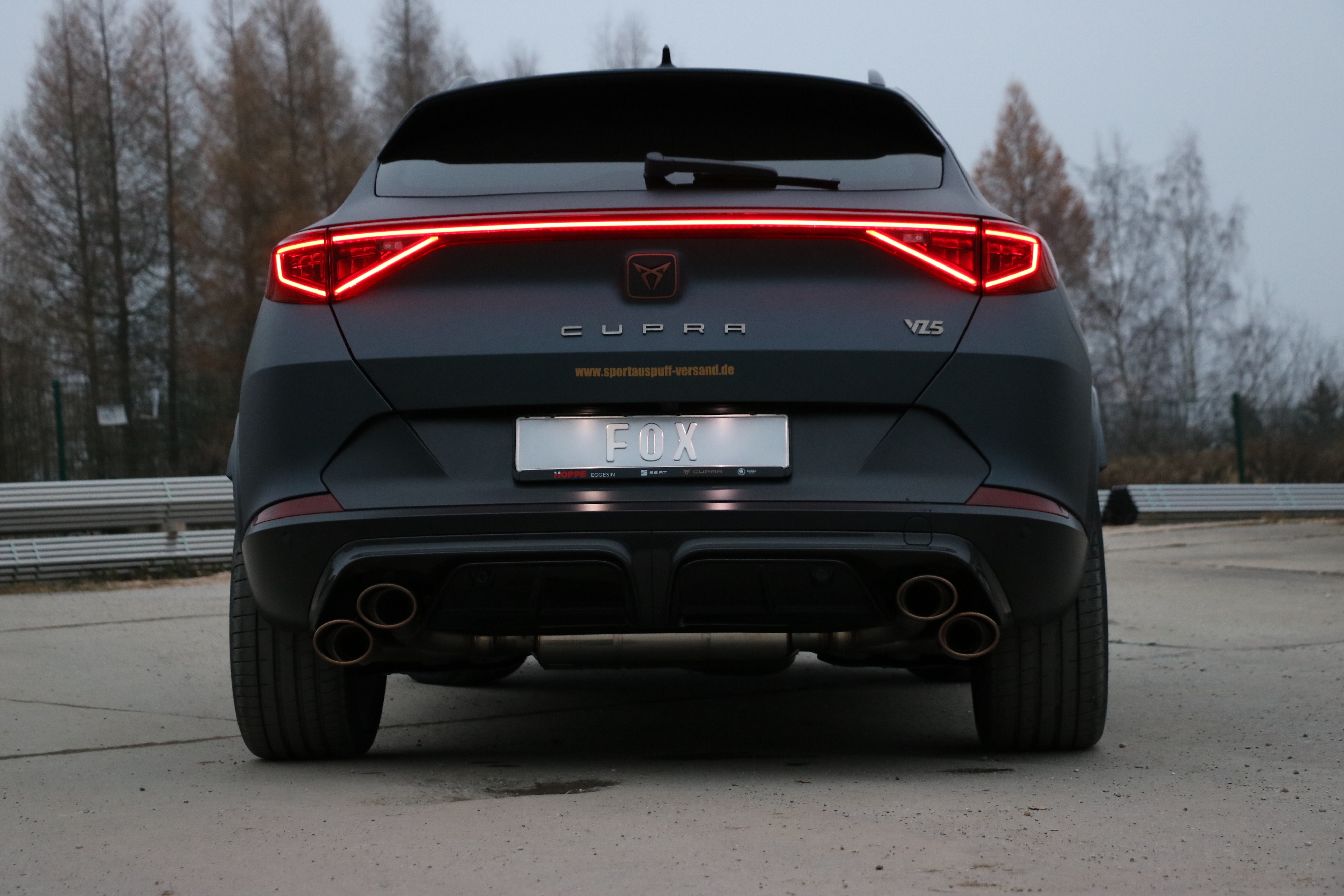 Dieser hochwertige FOX Endschalldämpfer aus Edelstahl wurde speziell passend für den CUPRA Formentor VZ5 4x4 entwickelt. Die Anlage wird in fünf präzise gefertigten Teilen geliefert: einem Hauptschalldämpfer und vier Endrohren, die über passgenaue Steckverbindungen montiert werden. Das System ist mit zwei Abgasklappen der Firma ASR Component GmbH ausgestattet. Die originalen Stellmotoren werden einfach aufgesetzt und verschraubt, wodurch das Öffnen und Schließen der Klappen weiterhin automatisch über die Fahrzeugmodule in Abhängigkeit der Geschwindigkeit erfolgt.