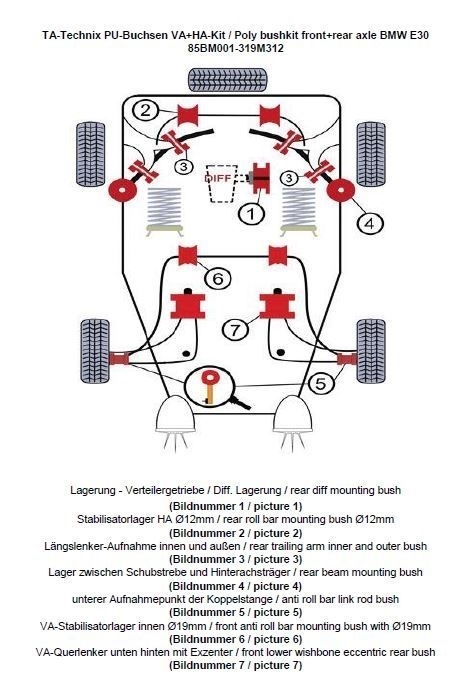 Das 37-teilige TA Technix PU-Buchsen Kit bietet eine optimale Lösung zur Verbesserung der Fahrwerksperformance passend für BMW 3er Serie E30. Durch den Einsatz hochwertiger PU-Buchsen wird das Fahrverhalten deutlich präziser, da unerwünschte Bewegungen in der Achsaufhängung reduziert werden. Dieses Komplettset umfasst Buchsen für Vorder- und Hinterachse, inklusive exzentrischer Lager für präzise Spur- und Sturzeinstellung.