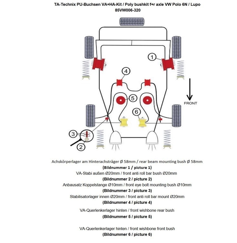 Das TA Technix PU-Buchsen Kit ist speziell für die Vorder- und Hinterachse von Fahrzeugen passend für Seat Arosa, VW Lupo und Polo konzipiert. Mit seinem hochwertigen Polyurethan-Material ersetzt es die herkömmlichen Gummilager und sorgt für eine deutlich präzisere Fahrwerksabstimmung sowie ein direkteres Handling. Durch die Reduzierung von Verformungen unter Last bietet dieses 30-teilige Set eine verbesserte Straßenlage und ein sportlicheres Fahrgefühl – optimal für alle, die mehr Kontrolle und Stabilität wünschen.