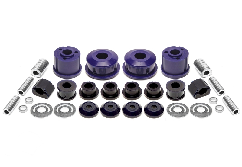 Es beinhaltet unter anderem Achskörperlager für den Hinterachsträger (Ø 58mm), Lager für den Vorderachs-Stabilisator (Ø 20mm), Querlenkerlager (vorne und hinten) sowie komplette Montagesätze für die Stabilisatorstützen. Dieses Set eignet sich ideal für sportlich orientierte Fahrerinnen und Fahrer, die ihr Fahrwerk professionell optimieren möchten – selbstverständlich eintragungsfrei.
