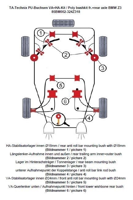 Das Set ist passend für BMW Z3 Roadster und Coupe der Serie E36 (ohne M Modelle) und enthält alle relevanten Buchsen für Stabilisatorlager, Querlenkeraufnahmen sowie Hinterachslager. Das Material bietet eine lange Haltbarkeit und bleibt auch unter hoher Belastung formstabil.
