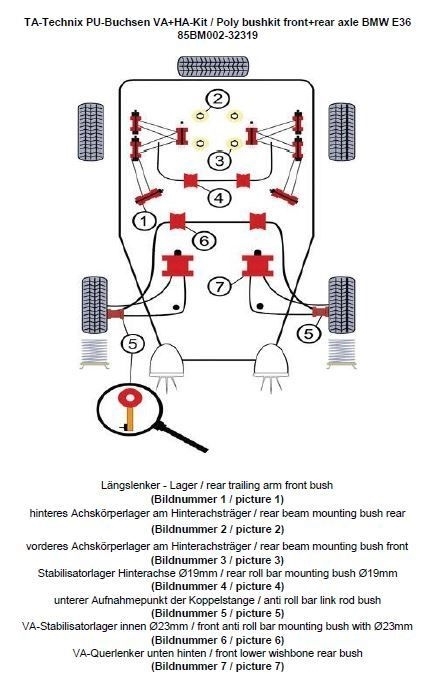 Das Kit ist eintragungsfrei und speziell passend für BMW 3er Serie E36 entwickelt, unabhängig von der Karosserievariante. Mit PU-Lagern an Vorder- und Hinterachse profitieren Sie von einer langlebigen, verschleißarmen Lösung für Ihr Fahrwerk.