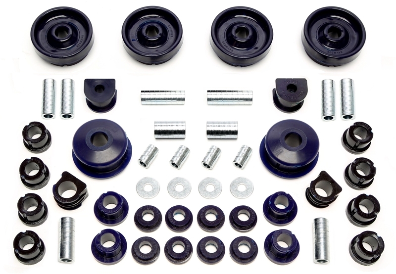 Das Vorderachse-Kit (28-teilig) enthält Buchsen für Koppelstangen/Pendelstützen-Aufnahmen, Stabilisatorlager (Ø 23 mm) sowie Querlenkerlager vorne und hinten. Das Hinterachse-Kit (20-teilig) beinhaltet Buchsen für Achslenkeraufnahmen, Stabilisatorlager (Ø 14 mm) und Hinterachs-Querlenkeraufnahmen. Das Kit ist eintragungsfrei und bietet eine hervorragende Lagergeometrie zur Minimierung unerwünschter Bewegungen und Verbesserung des Handling-Verhaltens.