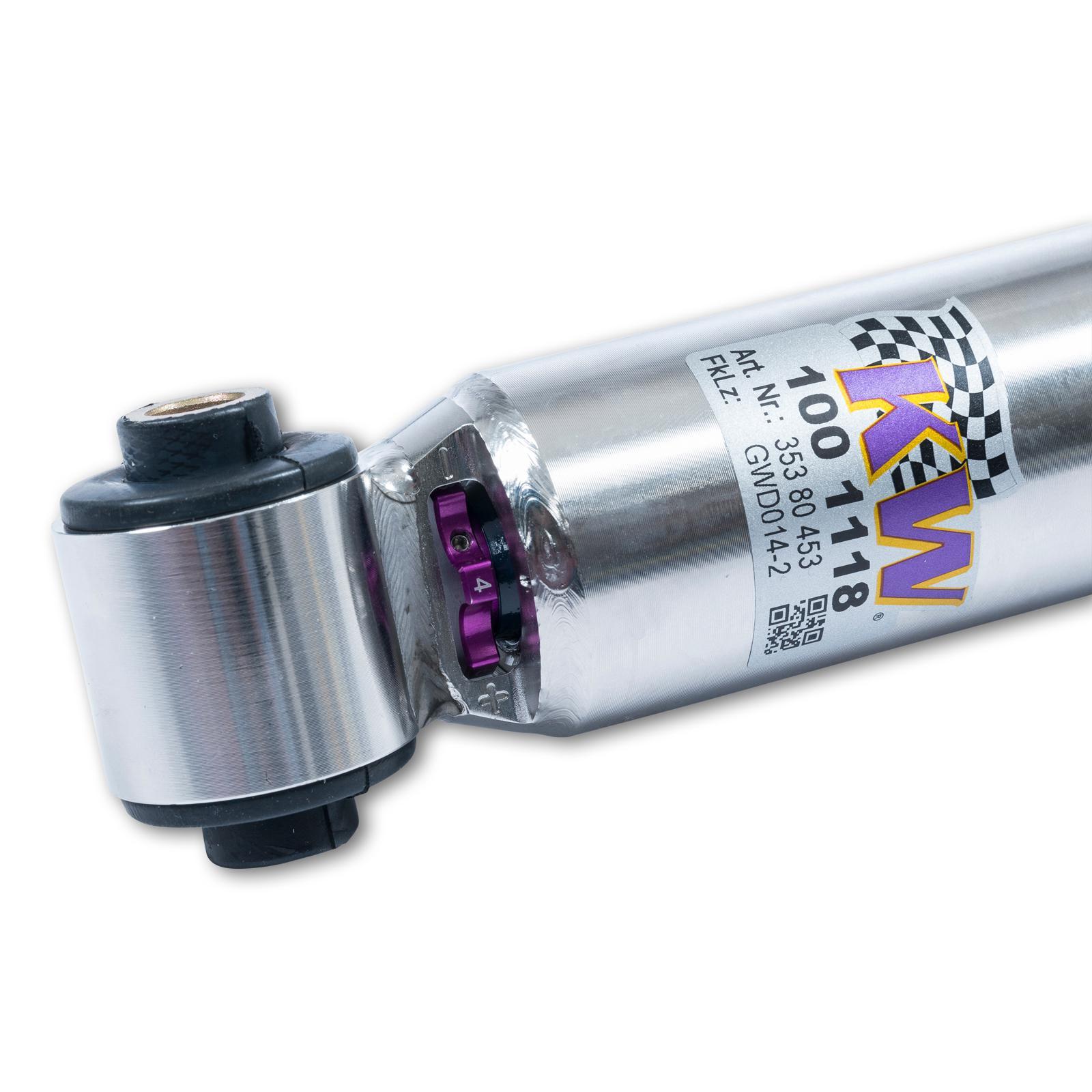 Die patentierte Ventiltechnik ermöglicht eine einfache Feineinstellung im Lowspeed-Bereich, ohne Werkzeug – ideal zur Anpassung an unterschiedliche Reifen- oder Felgenkonfigurationen. Das aus Edelstahl gefertigte KW V3 überzeugt durch seine Langlebigkeit und Korrosionsbeständigkeit. Das Trapezgewinde und der Polyamid-Gewindering gewährleisten dauerhaft eine stufenlose Tieferlegung und ein exaktes Setup – sowohl für sportliche Straßenfahrzeuge als auch anspruchsvolle Tuningprojekte.
