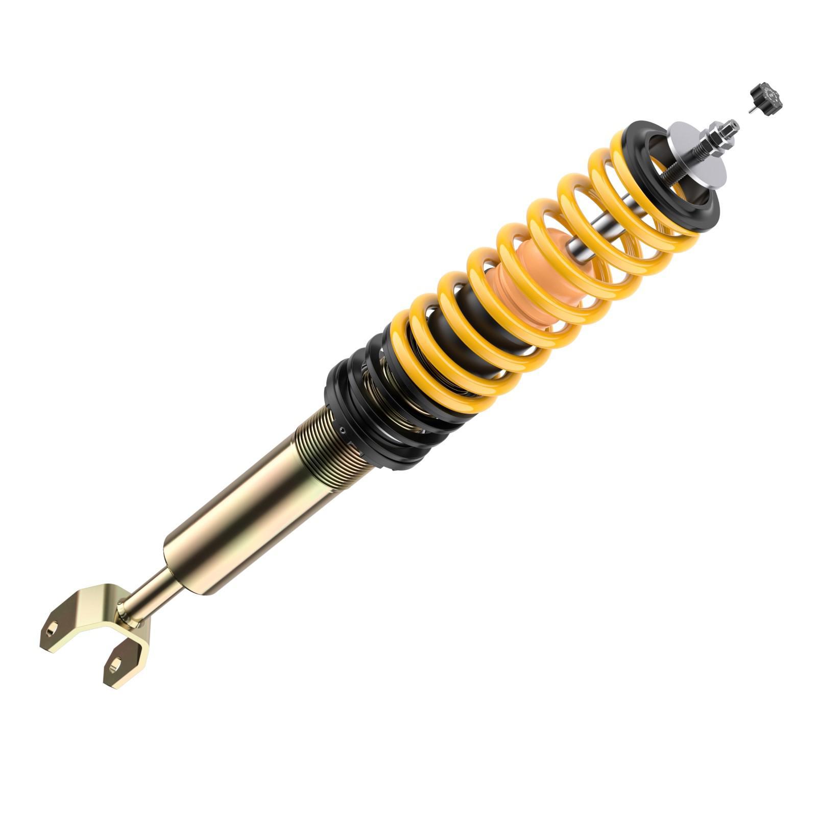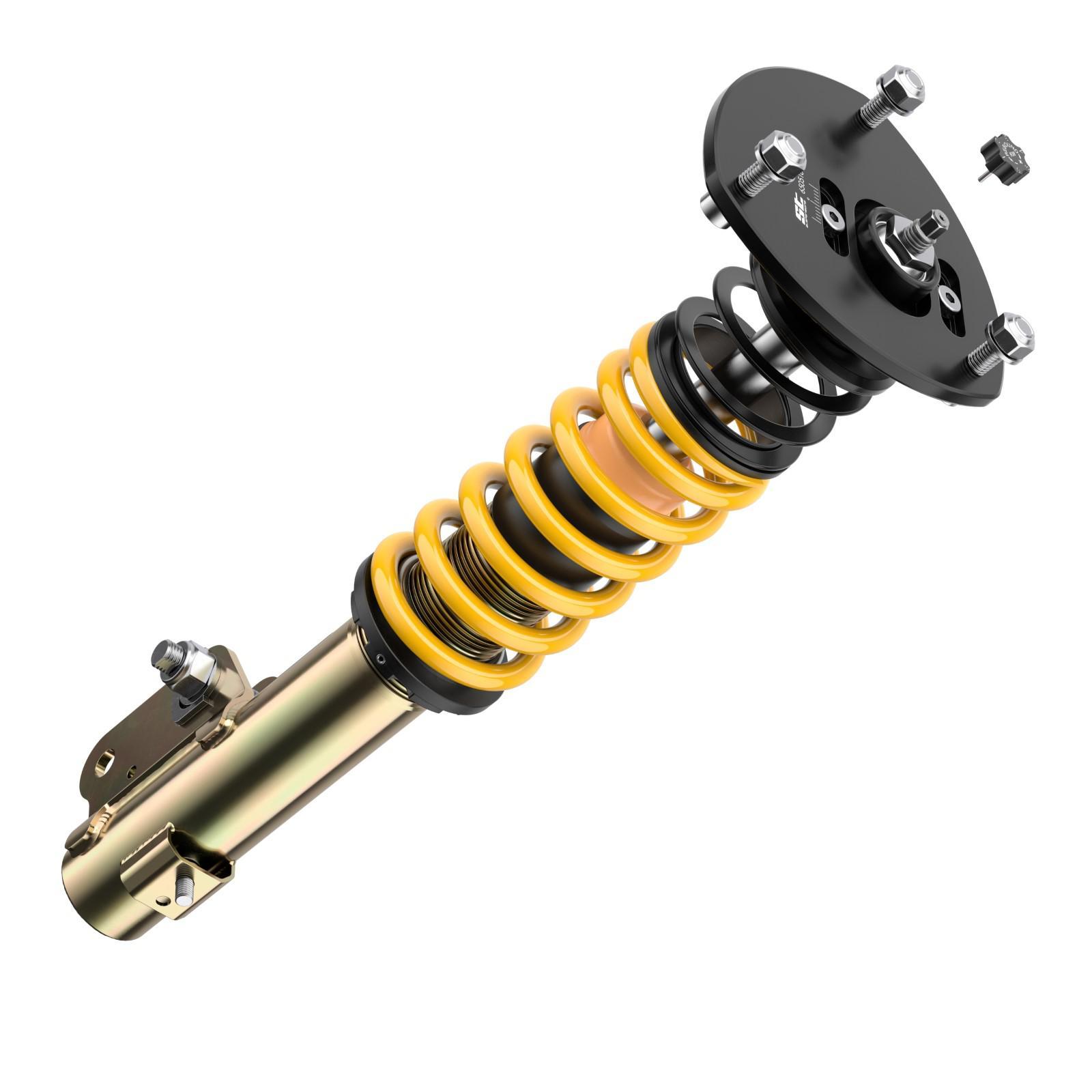 Die Dämpferverstellung erfolgt komfortabel am oberen Ende der verchromten Kolbenstange. Durch eine Erhöhung der Zugkraft werden Spurtreue und Fahrsicherheit verbessert, während eine weichere Abstimmung für zusätzlichen Komfort sorgt. Selbst im Grundsetup bietet das ST XTA Fahrwerk ein spürbar agileres Fahrgefühl und ein präziseres Lenkverhalten als das Serienfahrwerk.