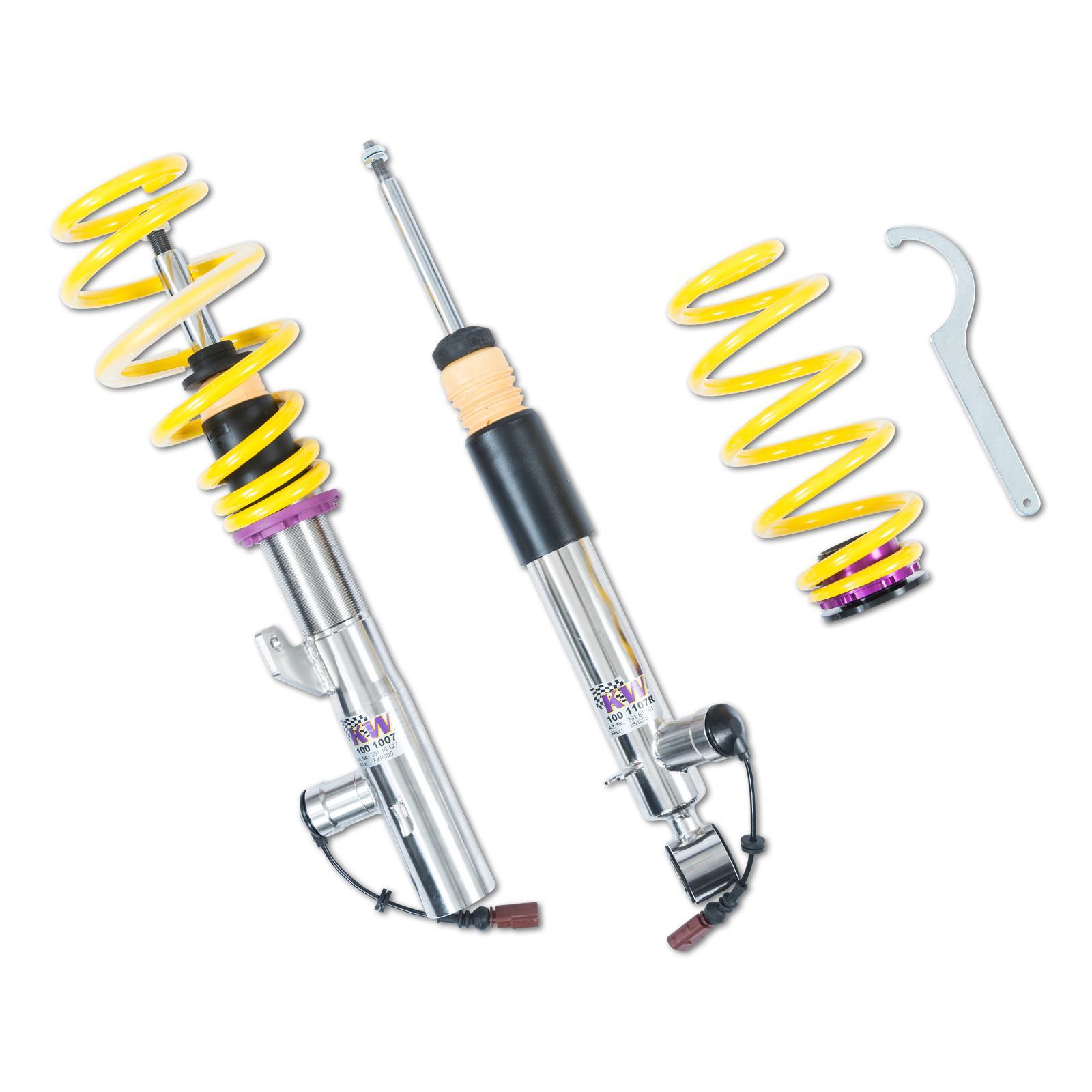 Das KW DDC Plug & Play Gewindefahrwerk kombiniert höchste Fahrdynamik mit modernster Elektroniksteuerung. Es ist die ideale Lösung, wenn Sie die serienmäßige elektronische Dämpferverstellung Ihres Fahrzeugs weiterhin nutzen und gleichzeitig eine sportlichere Optik sowie präzisere Straßenlage wünschen. Dank der Plug & Play Technologie wird das Edelstahlfahrwerk direkt über die KW DDC Steckverbindung mit dem Originalsystem Ihres Fahrzeugs verbunden – ohne weitere Umprogrammierung oder Änderungen an der Bordelektronik. Das Steuergerät erkennt das Fahrwerk automatisch, sodass alle Anzeigen und Bedienelemente im Innenraum voll funktionsfähig bleiben.