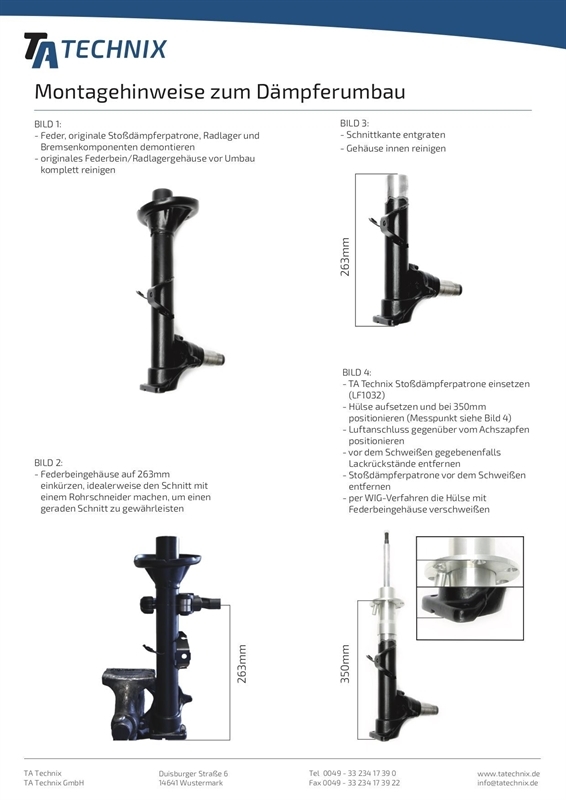Hinweis: Bei diesem System ist es nicht notwendig, die originalen vorderen Federbeine für den Umbau einzusenden. Mit Hilfe einer Anschweißhülse und einer detaillierten Einbauanleitung, die der Bestellung beiliegt, kann der Umbau der Luftdämpfer von einem Fachmann durchgeführt werden.