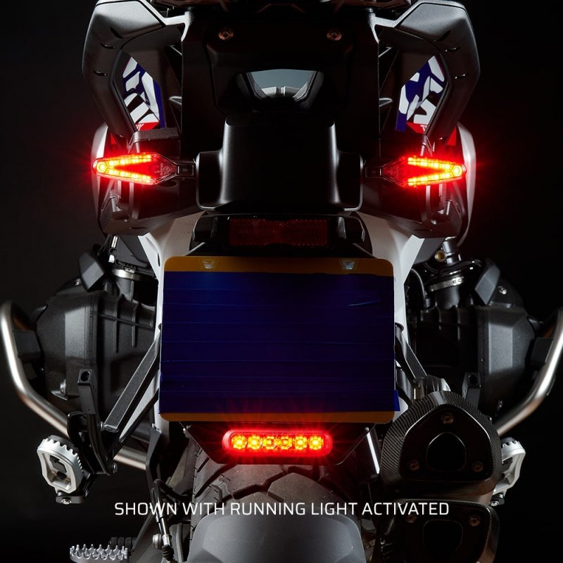 Beim Aktivieren des Blinkers wird das Tagfahrlicht und Bremslicht in der Blinkereinheit automatisch deaktiviert, wodurch das Blinksignal deutlich und klar wahrnehmbar bleibt. Ein zusätzlicher Ausgang ermöglicht den Anschluss eines Denali T3 Bremslichts, das bei Aktivierung mit 100 % Helligkeit leuchtet. Diese Version ist besonders für europäische Länder geeignet, in denen ein drittes Bremslicht am Motorrad zulässig ist.