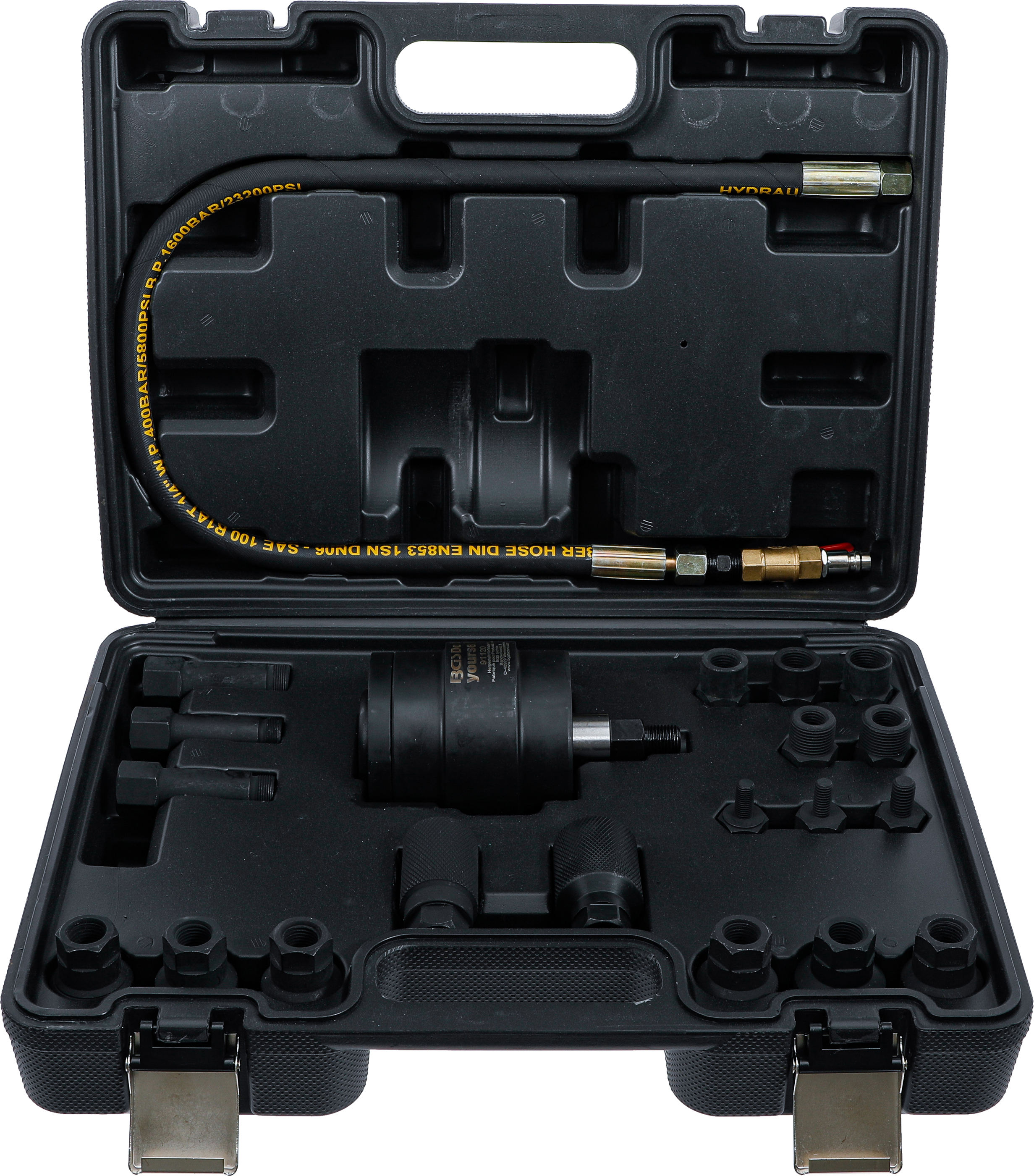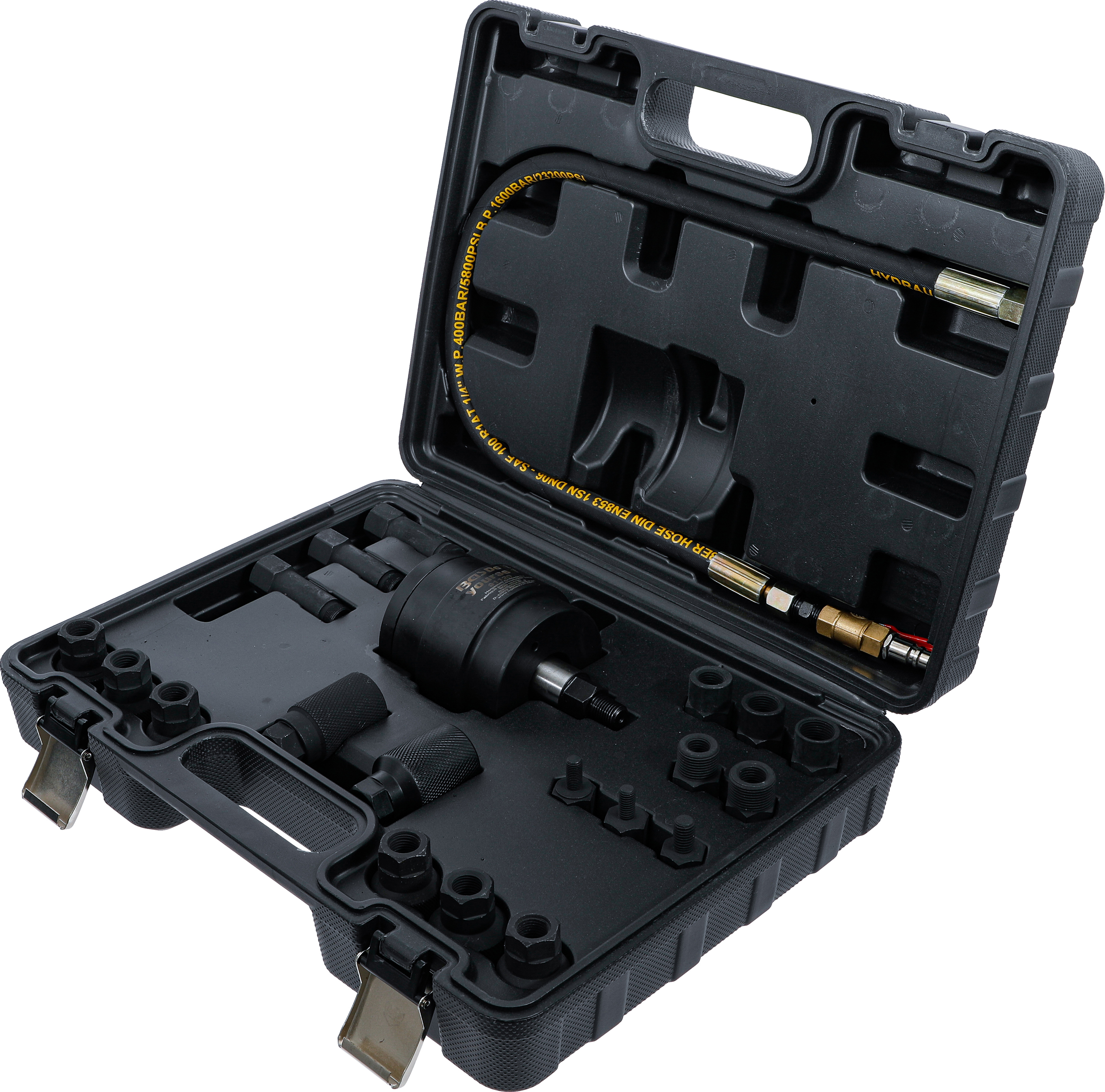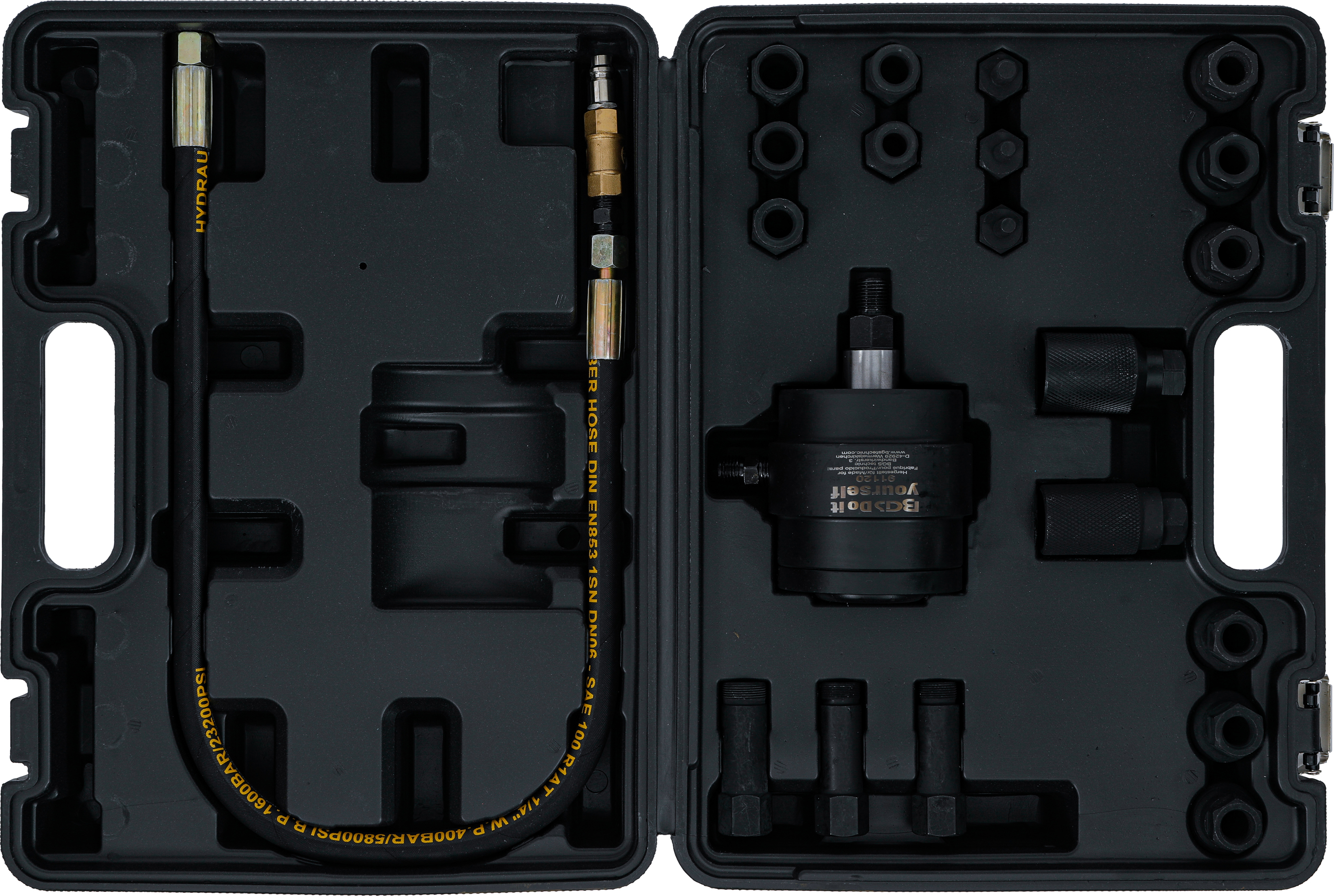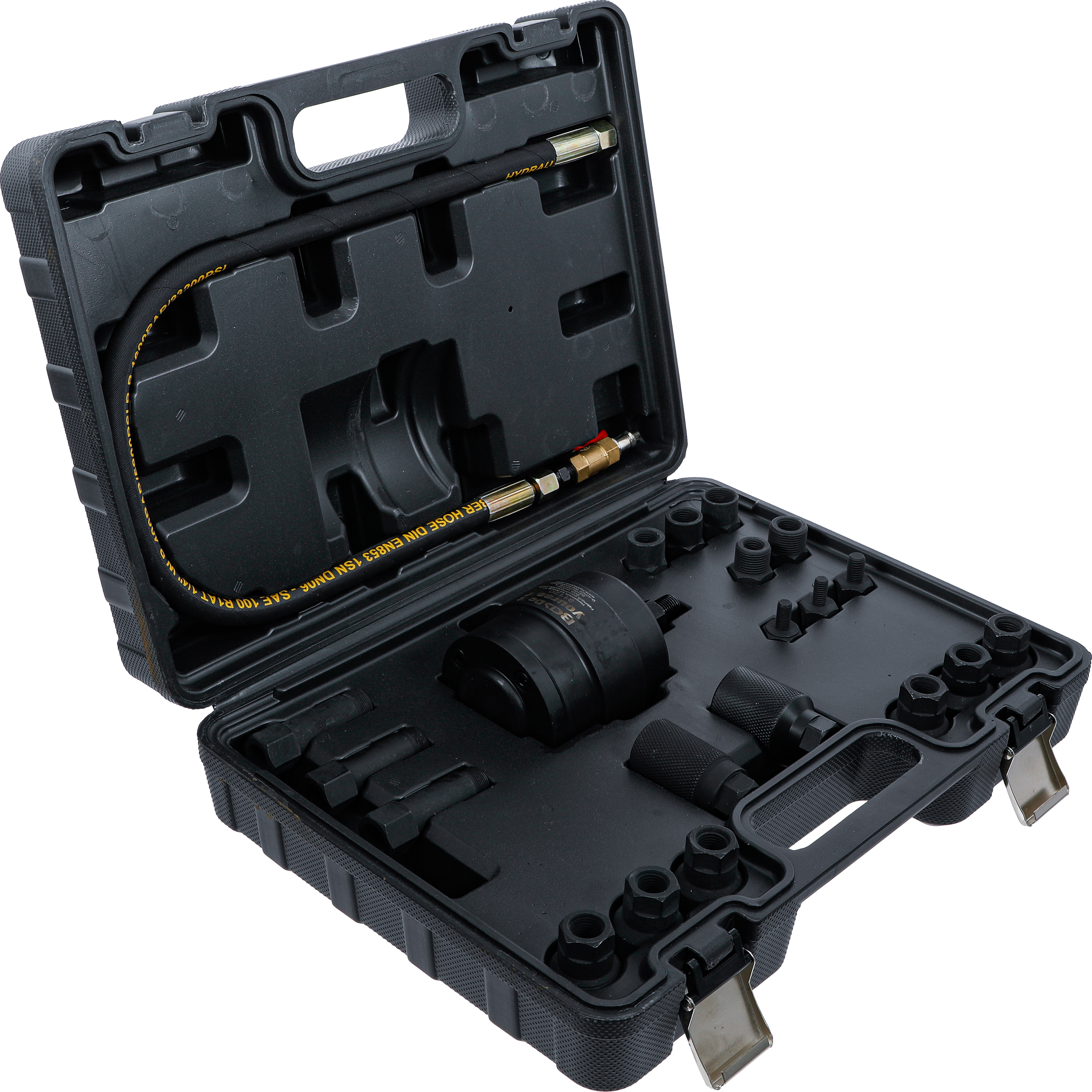 Der 21-tlg. pneumatische Injektoren-Auszieher-Satz ist ein professionelles Werkzeug zur druckluftunterstützten Demontage von besonders festsitzenden Diesel-Injektoren. Durch die pneumatisch erzeugte Schlagwirkung werden selbst stark verkokte oder verrostete Einspritzdüsen zuverlässig aus dem Zylinderkopf gelöst. Mit dem passenden Adapter wird der Auszieher direkt am Injektor verschraubt, um präzise und sichere Arbeit zu ermöglichen. Die kompakte Bauweise und die hohe Schlagleistung sorgen für effizientes Arbeiten auch an schwer zugänglichen Motoren.