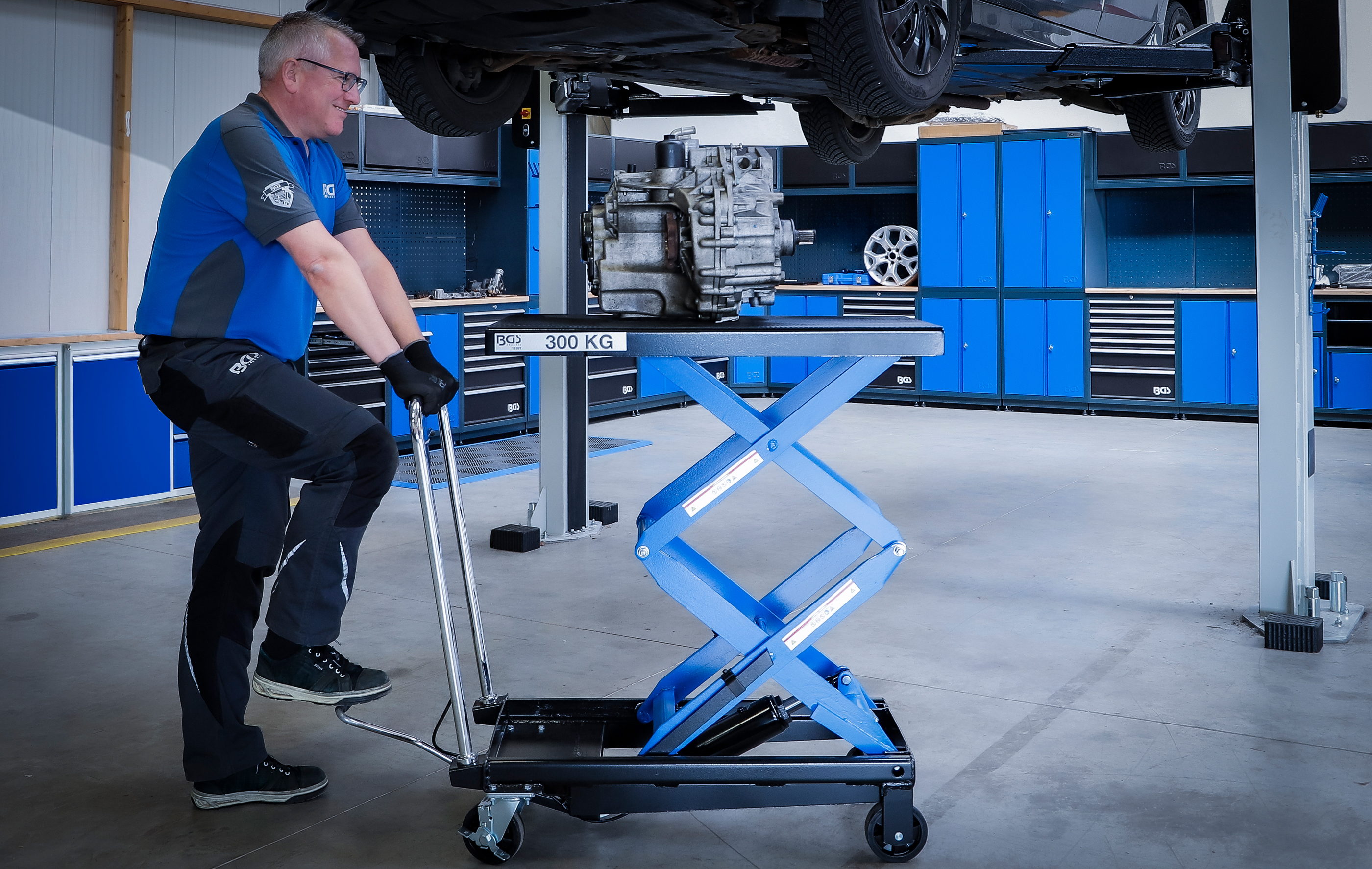 Mit dem hydraulischen Scherenhubtisch heben und transportieren Sie mühelos schwere Lasten bis zu 300 kg. Dank der stabilen Doppelscheren-Stahlkonstruktion und des leichtgängigen hydraulischen Fußpedalsystems lässt sich die Arbeitsplattform stufenlos zwischen 360 mm und 1290 mm Höhe verstellen. Dies ermöglicht ein ergonomisches und sicheres Arbeiten, etwa beim Anheben von Motoren, Getrieben oder anderen schweren Werkstattkomponenten.
