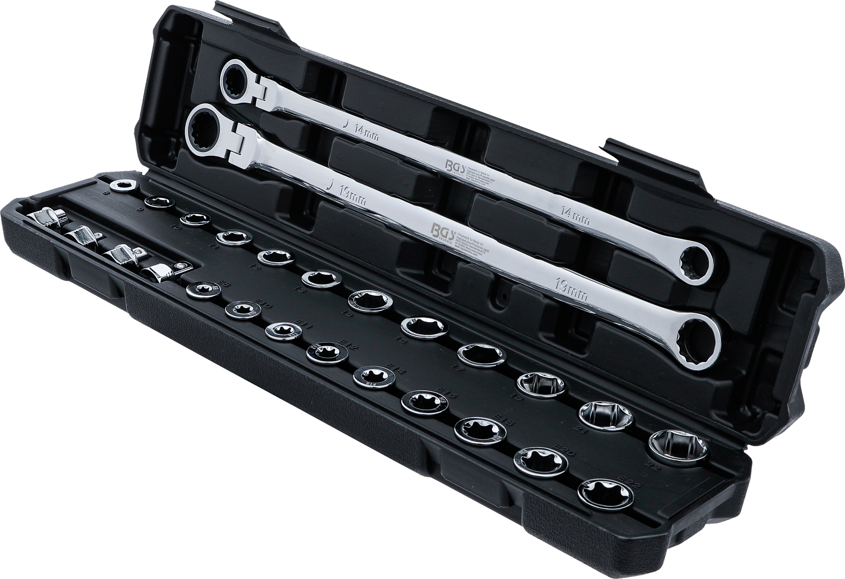 Der 27-teilige Doppel-Ring- und Ratschenring-Gelenkschlüssel-Satz vereint Präzision, Langlebigkeit und Vielseitigkeit in einem kompakten Werkzeugset. Gefertigt aus hochwertigem Chrom-Vanadium-Stahl mit hochglanzverchromter Oberfläche, bietet dieser Satz optimale Stabilität und Schutz vor Korrosion. Die extra langen Schlüssel ermöglichen eine effiziente Kraftübertragung selbst an schwer zugänglichen Stellen. Dank des feinverzahnten Ratschenmechanismus mit 72 Zähnen und einem Rückschwenkwinkel von nur 5° arbeiten Sie präzise und zeitsparend. Durch die Zwölfkant-Abtriebsprofile und geraden Ausführungen wird das Drehmoment optimal übertragen, was ideal für professionelle Einsätze in Werkstatt und Handwerk ist. Die flexiblen Durchsteckeinsätze und Adapter erweitern die Einsatzmöglichkeiten zusätzlich und machen den Satz zu einer vielseitigen Lösung für Schraubarbeiten jeder Art.