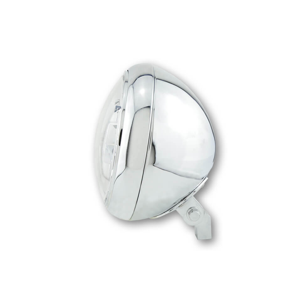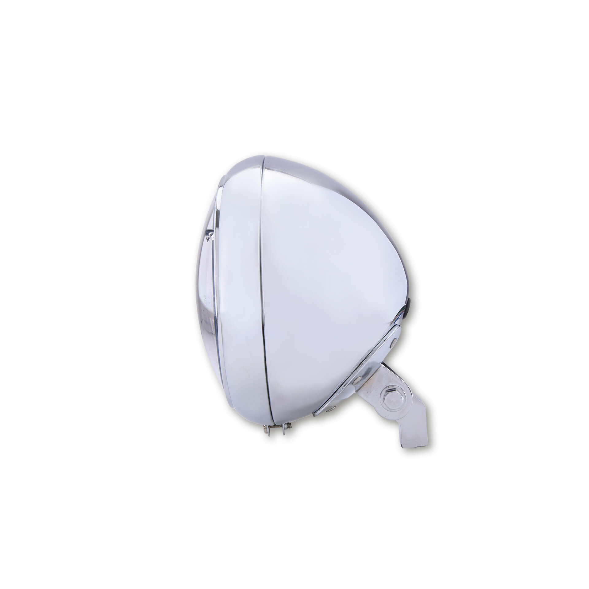 Im oberen Segment des Scheinwerfers befindet sich das Abblendlicht, während beim Zuschalten des Fernlichts der untere Bereich hinzukommt. Der asymmetrische, verchromte Reflektor ist speziell für den Rechtsverkehr zugelassen und selbstverständlich E-geprüft. Die Kombination aus robustem Metallgehäuse, klarem Glas und präziser Lichtverteilung sorgt für Sicherheit und Stil zugleich.