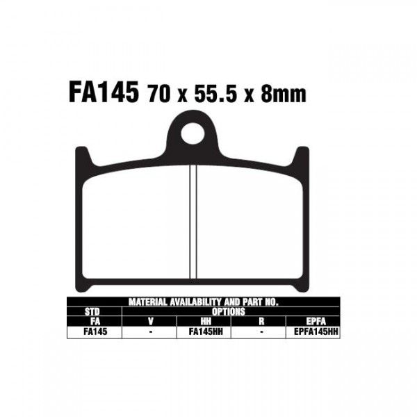 Die EBC FA145 HH Bremsbeläge sind hochwertige Sintermetall-Beläge, die speziell für sportliche Motorradfahrer entwickelt wurden. Dank der HH-Klassifizierung bieten diese Beläge eine ausgezeichnete Bremsleistung sowohl bei Nässe als auch bei hohen Temperaturen. Die Beläge sorgen für eine präzise Dosierbarkeit, gleichbleibend hohe Reibwerte und eine überdurchschnittlich lange Lebensdauer. Ideal im sportlichen Straßen- und Rennbetrieb geeignet, gewährleisten die EBC FA145 HH eine sichere Bremsperformance ohne Fading. Sie sind passgenau gefertigt und lassen sich schnell und unkompliziert montieren.