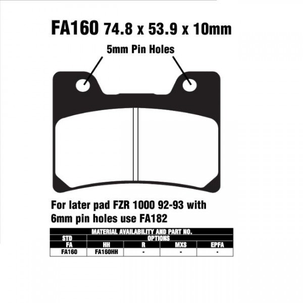 Der EBC Bremsbelag FA160 bietet Ihnen zuverlässige Bremsleistung für zahlreiche Yamaha Motorradmodelle. Diese Bremsbeläge überzeugen durch eine präzise gefertigte Mischung aus hochwertigen Materialien, die ein gleichmäßiges Bremsverhalten und lange Lebensdauer gewährleisten. Besonders bei sportlicher Fahrweise profitieren Sie von der hohen Temperaturbeständigkeit und konstanten Bremskraft der EBC Belagmischung. Ideal für Fahrerinnen und Fahrer, die Wert auf Sicherheit und Performance legen.