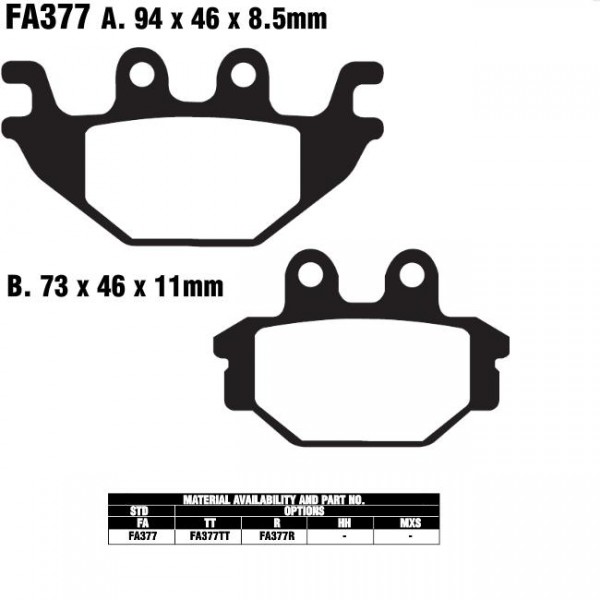 Die EBC FA377 Bremsbeläge bieten erstklassige Bremsleistung und sind eine zuverlässige Wahl für Fahrer, die Wert auf Qualität und Sicherheit legen. Diese organischen Bremsbeläge werden aus hochwertigen Materialien gefertigt, um eine starke Bremswirkung bei gleichzeitig geringer Abnutzung der Bremsscheibe zu gewährleisten. Besonders im Straßen- und Offroad-Einsatz überzeugen sie durch konstante Performance und ein präzises Ansprechverhalten. Das Modell EBC FA377 ist speziell passend für verschiedene Kymco und Yamaha Modelle entwickelt und bietet in jeder Fahrsituation optimale Kontrolle und Bremspräzision.