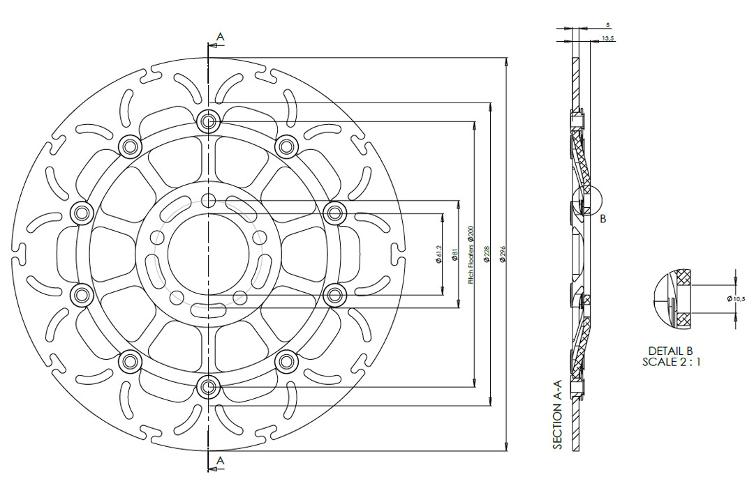 Mit einem Scheibendurchmesser von 296 mm, Lochkreis 81 mm und Innenringdurchmesser 61 mm ist die Bremsscheibe perfekt auf die Anforderungen sportlicher Fahrer abgestimmt. Dank ABE ist keine zusätzliche Eintragung erforderlich.