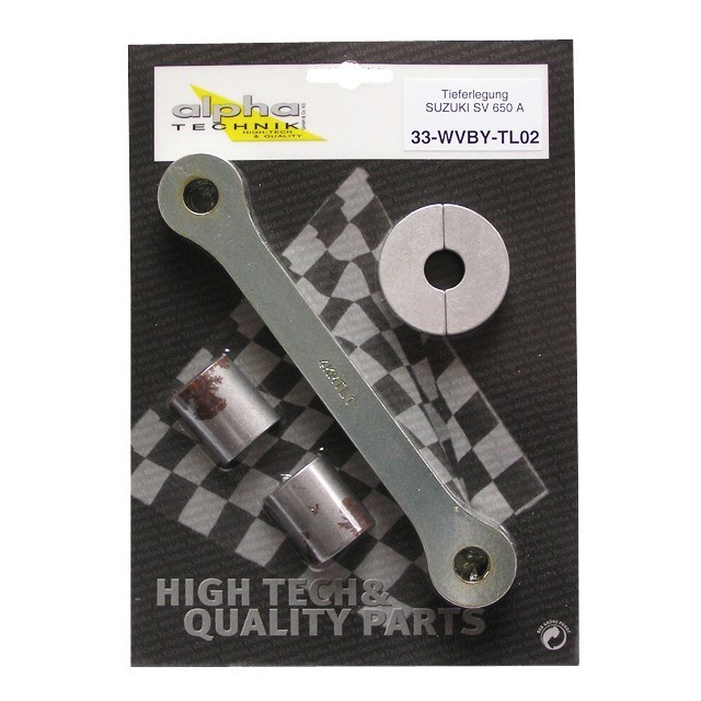 Der alpha Technik Tieferlegungssatz passend für Suzuki SV650 Typ WVBY ab Modelljahr 2007 sorgt für eine Sitzhöhenreduzierung von ca. 28 mm. Damit genießen Sie eine verbesserte Standsicherheit und mehr Vertrauen beim Rangieren und Anhalten. Die Tieferlegung wird gemessen an der Sitzfläche und garantiert somit eine echte Reduzierung der Sitzhöhe. Durch die fahrzeugspezifische Entwicklung jedes Kits bleibt die dynamische Fahreigenschaft nahezu unverändert. Das hochwertige Material und die präzise Fertigung sorgen für eine lange Lebensdauer und maximale Sicherheit. Der Einbau ist dank der detaillierten und bebilderten Anleitung schnell und einfach durchgeführt. Die Lieferung erfolgt mit allen benötigten Umbauteilen und ABE.