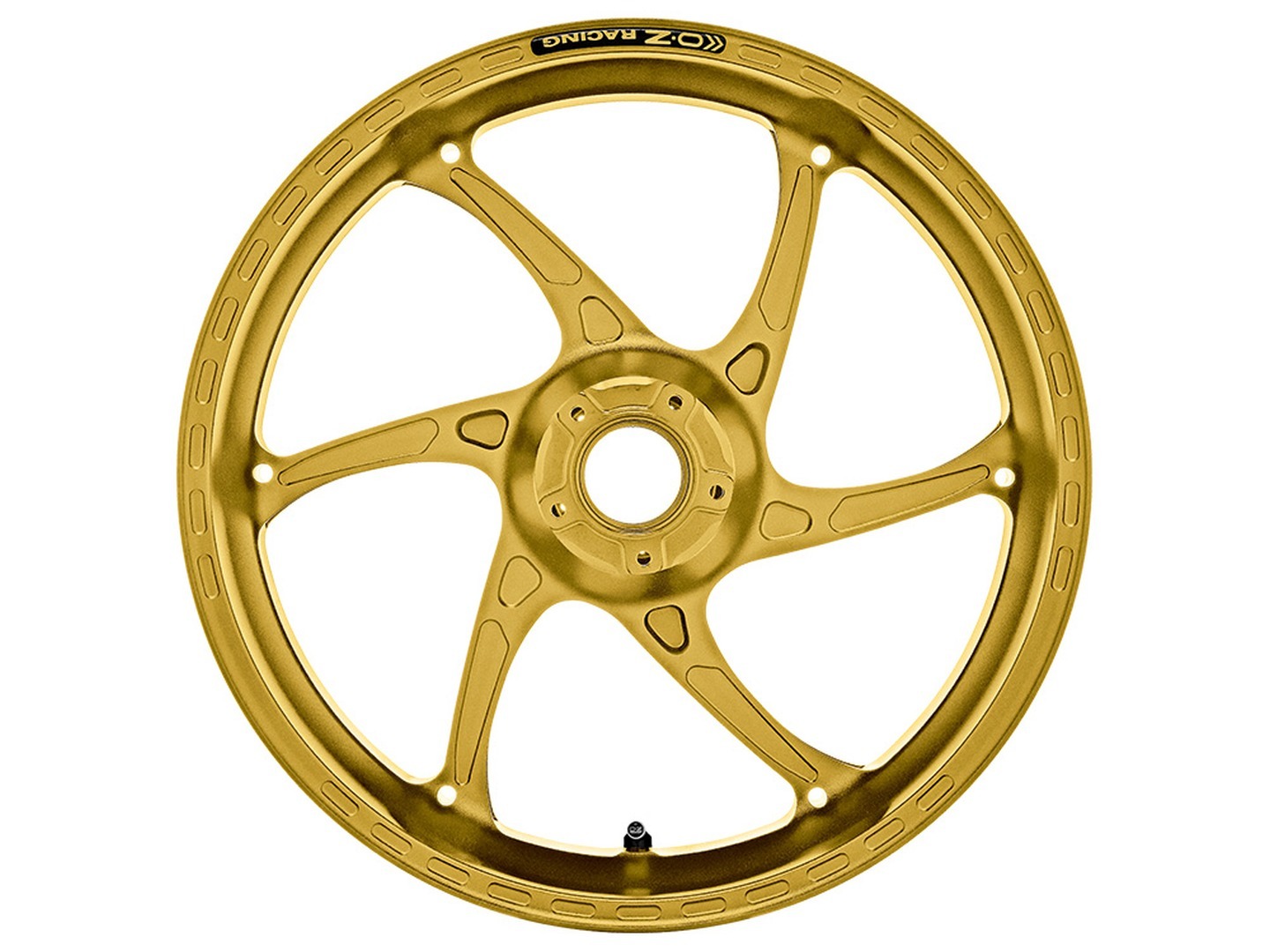 Die OZ Gass RS-A Aluminium Hinterradfelge überzeugt durch ihr besonders geringes Gewicht und höchste Stabilität. Die Felge ist goldfarben matt eloxiert, besitzt 6 Speichen und wird inklusive Ventil und Kettenradträger geliefert. Dank der aufwendigen Schmiedetechnologie und Fertigung nach der FE-Methode (Finite-Element-Analyse) wird eine ideale Kombination aus Leichtbau und Festigkeit erzielt. Dies führt zu einer deutlichen Gewichtsreduzierung, verbessertem Beschleunigungsverhalten, kürzeren Bremswegen und einem präziseren Einlenkverhalten. Das Handling des Motorrads wird so spürbar agiler, während das sportliche Design mit den markanten Aussparungen im Felgenbett für einen optischen Akzent sorgt.
